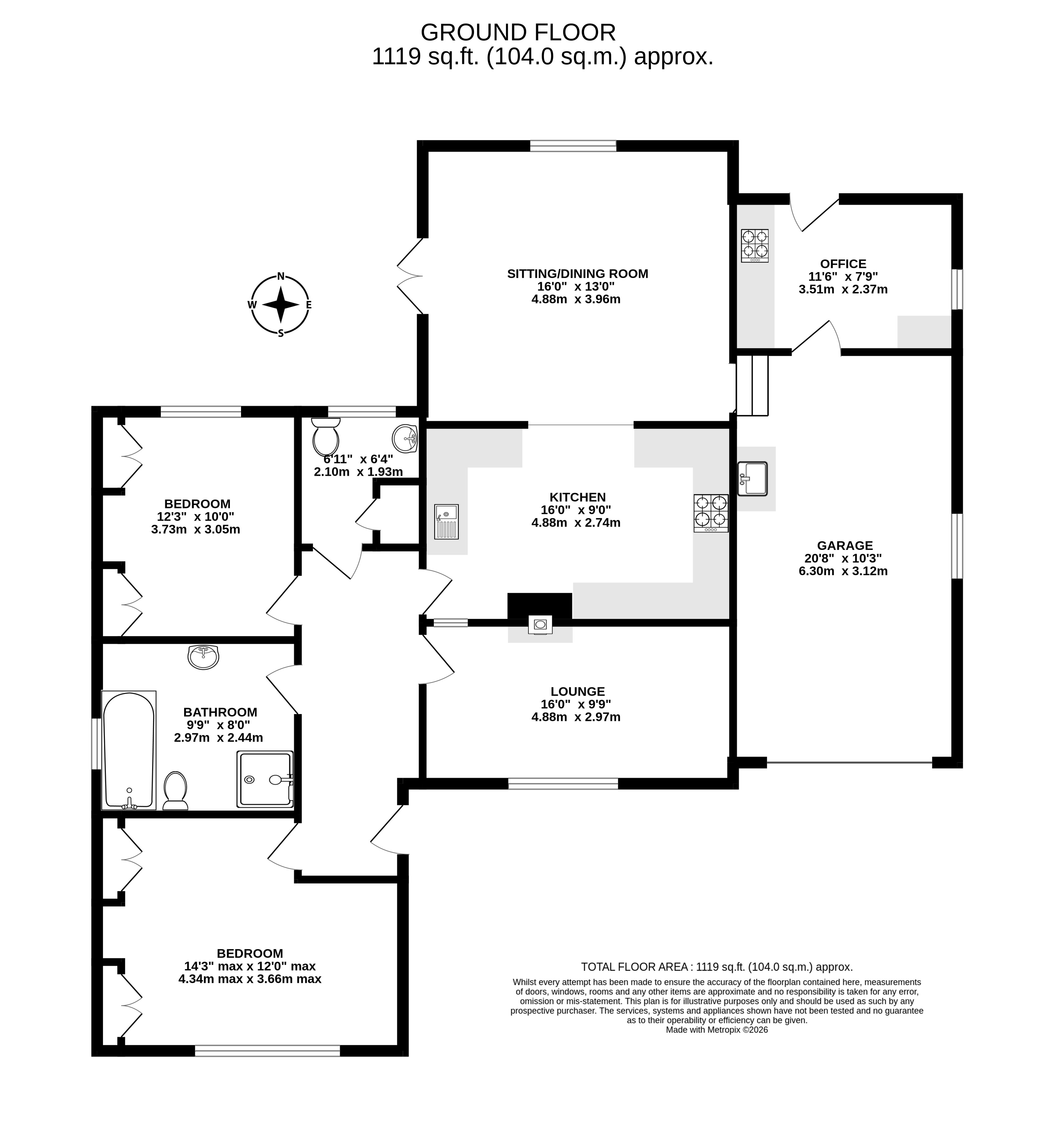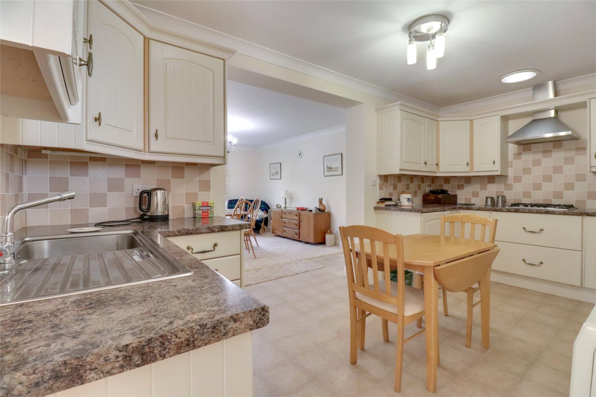 Upon entering, the welcoming hall provides access to all principal rooms. The master bedroom sits to the front, a generous double with a large window and built in storage. The spacious family bathroom offers both a bath and separate shower, WC and basin, while the second double bedroom enjoys a rear aspect and fitted storage. A separate WC with hand basin and useful linen cupboard adds further convenience. The comfortable lounge features a front facing window and a multifuel stove, creating a cosy focal point. The kitchen flows through to an impressive dining/family room which is light and airy, with a rear window and double doors opening onto the garden. From here, access leads into the garage, which has power and plumbing, and on into an additional room currently used as an office, offering excellent scope as a utility, hobby room, or boot room.
