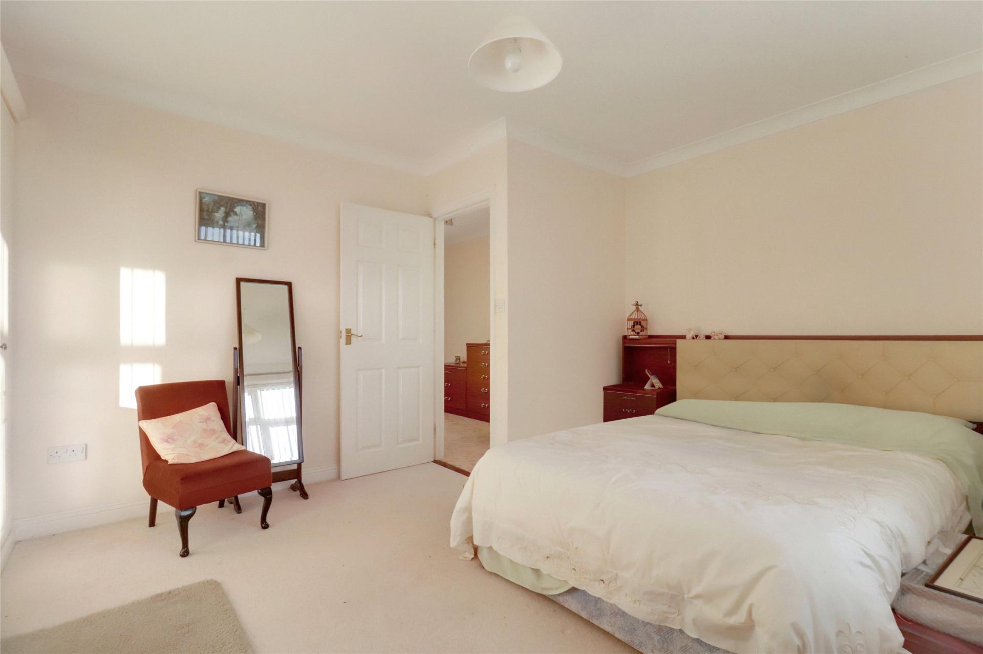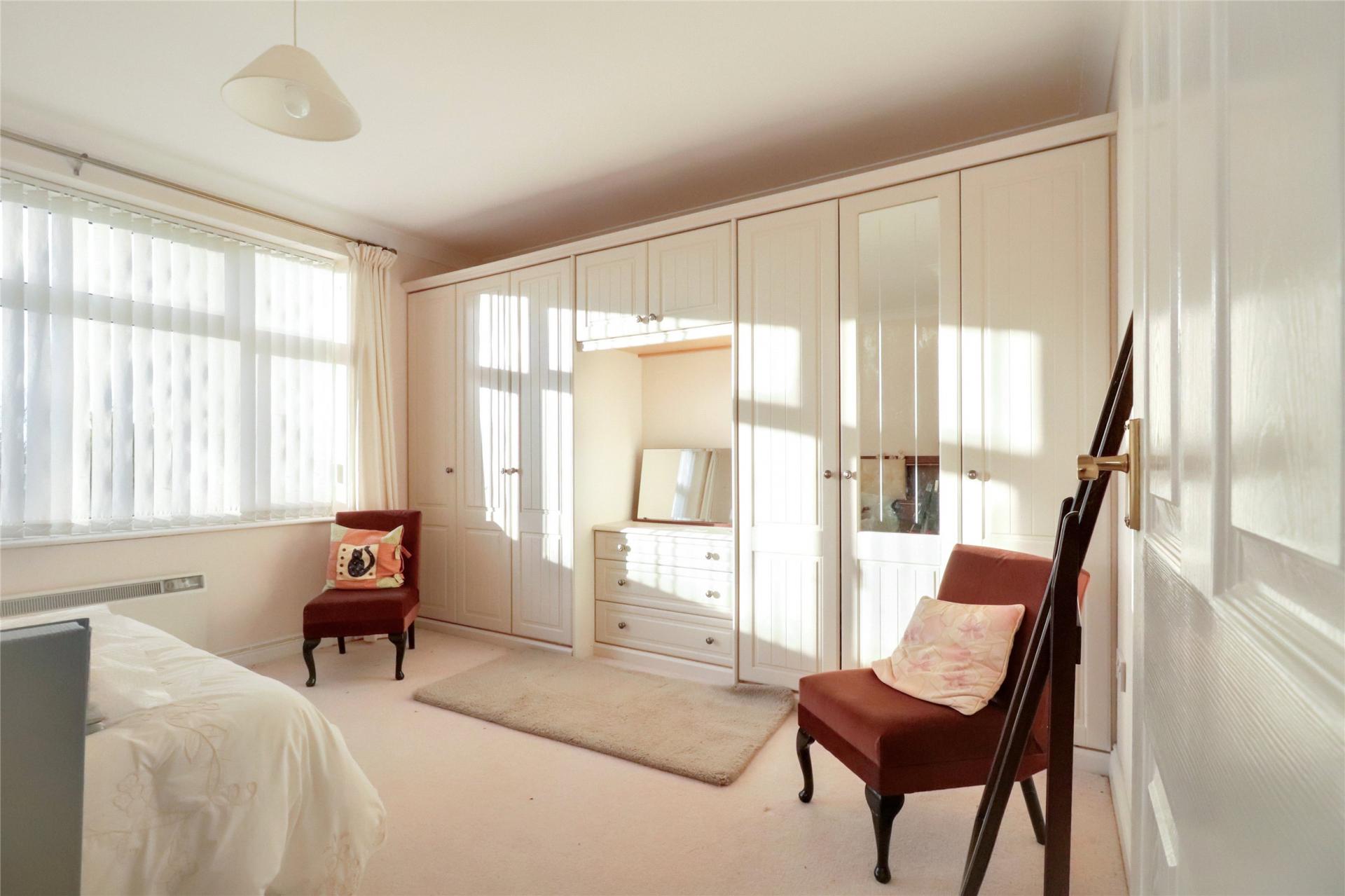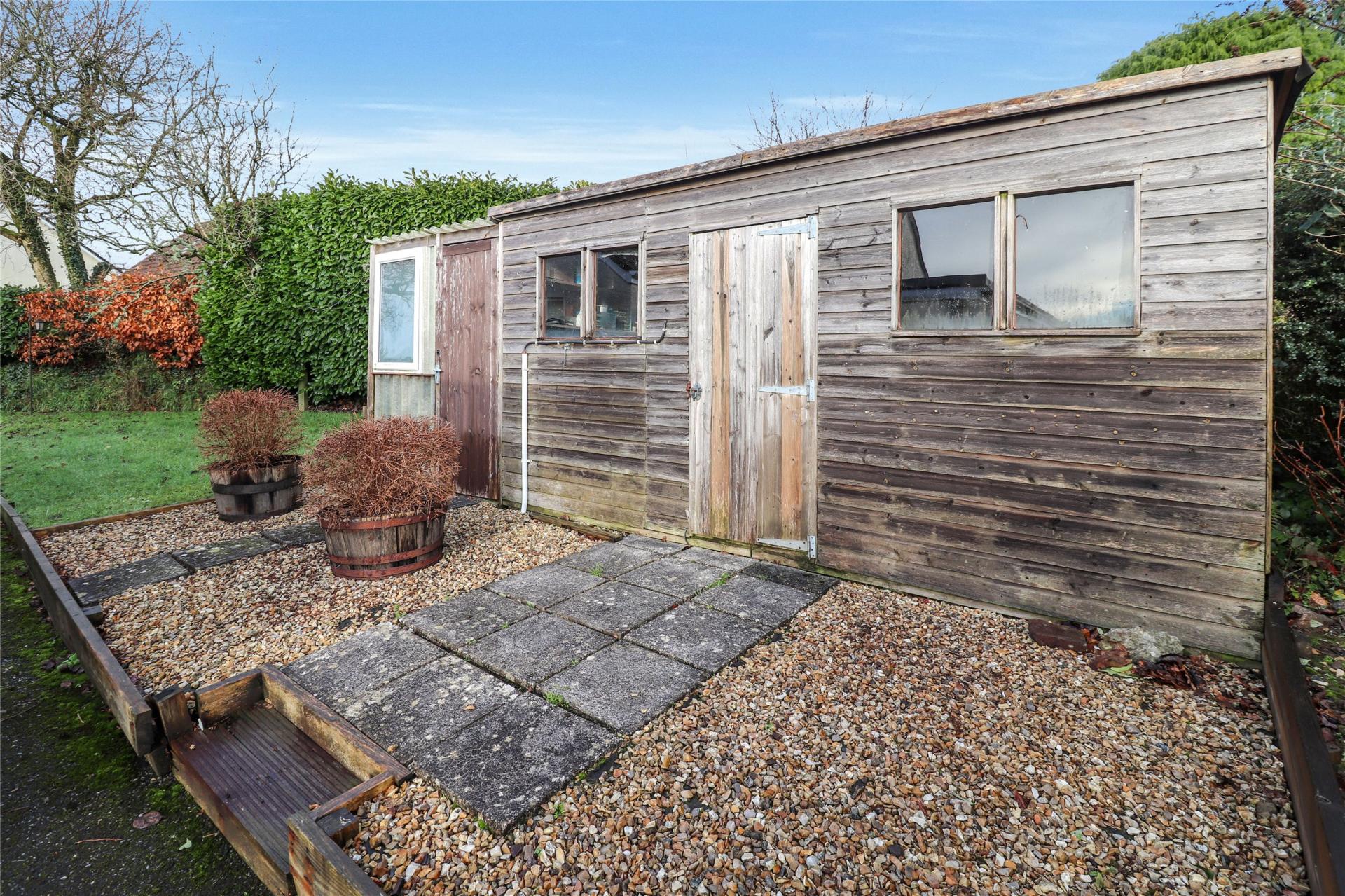 The property is surrounded by generous wraparound gardens, offering excellent privacy and plenty of space for outdoor living. Mature shrubs and established trees create an attractive backdrop, with areas ideal for seating, entertaining, or gardening. Two useful storage sheds sit within the grounds. A level parking area lies to the front of the bungalow, and the elevated position enjoys pleasant views towards St Mary Magdalene Church.