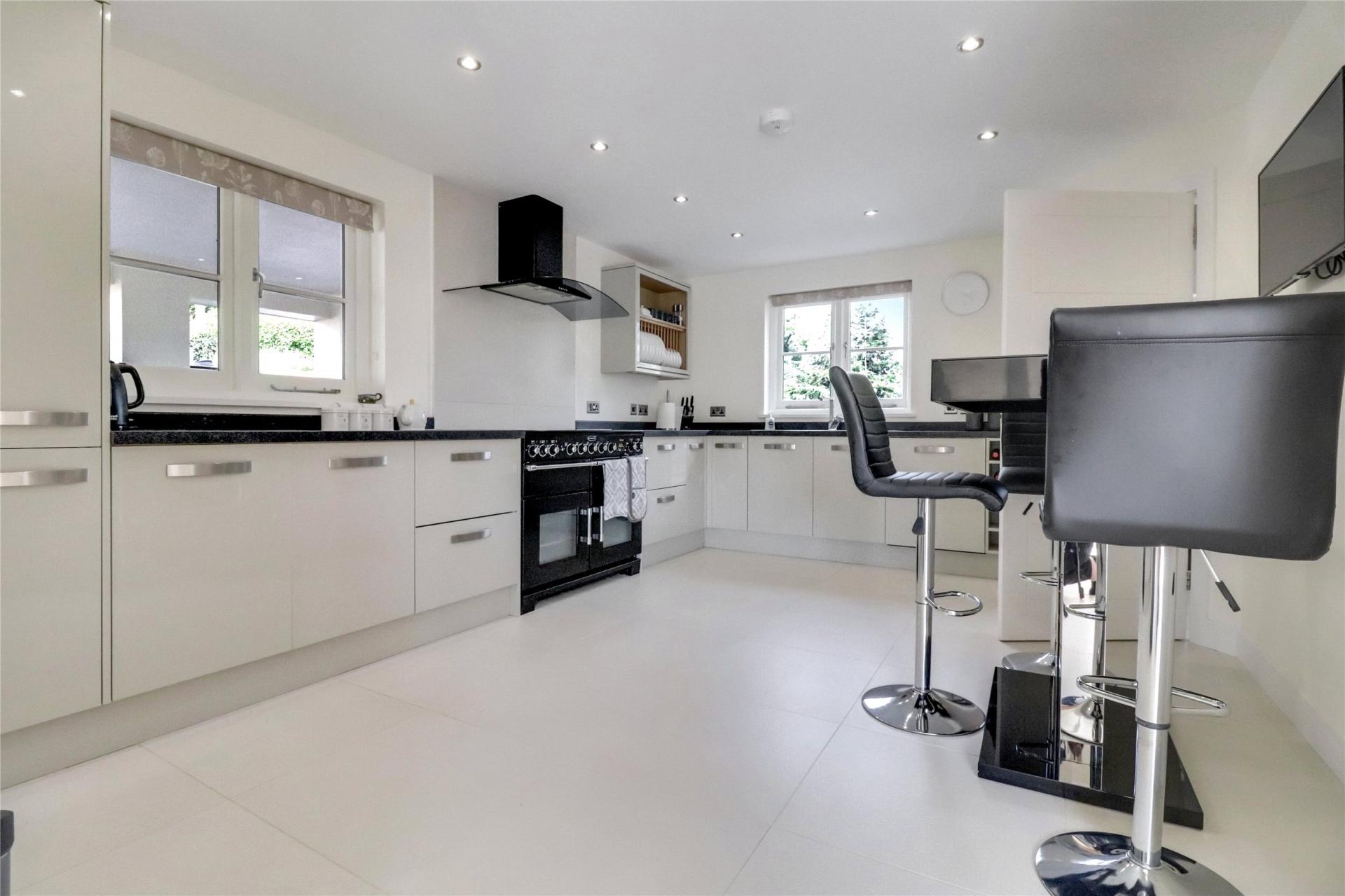 A spacious entrance hall welcomes you into the home, with doors leading to all principal rooms and stairs rising to the first floor. To the right is the superbly appointed kitchen, featuring matching wall and base units, integrated dishwasher and fridge freezer, a freestanding Rangemaster double cooker, and a central breakfast island. Off the kitchen is a useful utility room with additional storage, space and plumbing for white goods, and a door to the rear garden. A ground floor cloakroom with WC and wash hand basin is also accessed via the utility room.