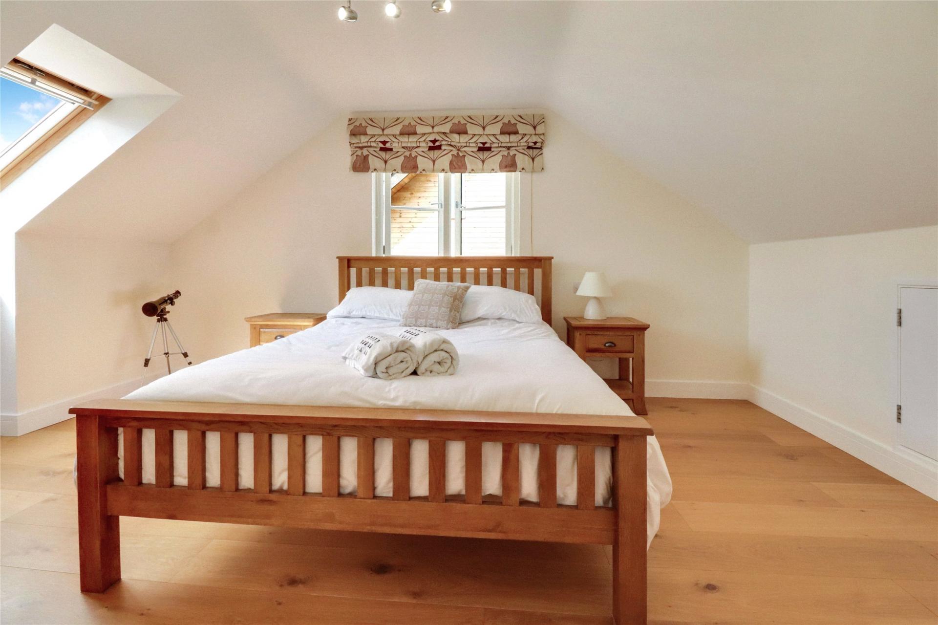 Upstairs, the master bedroom is generously proportioned and enjoys lovely views, along with a stylish en-suite bathroom featuring a bath, separate shower, WC, and vanity unit with wash hand basin. Bedroom two is another spacious double with dual aspect windows and fitted wardrobes, while bedroom three also offers ample space, fitted wardrobes, and useful eaves storage. Bedroom four, currently used as a home office, is also a comfortable double room. The family bathroom is equally well-appointed, comprising a bath, separate shower, WC, and a vanity unit with wash hand basinideal for family living or guests. The first floor benefits from engineered oak flooring throughout the landing and bedrooms, while both bathrooms feature tiled floors with underfloor heating.