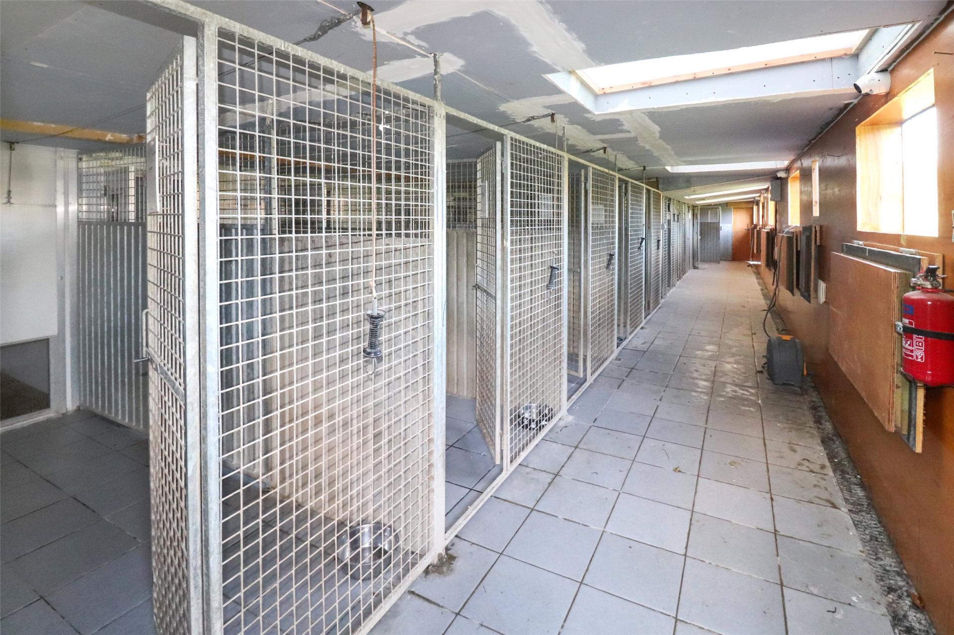 A gravelled driveway leads to the main reception block, an open-fronted building housing seven secure kennels and a covered area for meeting dog owners, as well as an adjoining dog grooming room. A large detached garage with electric roller doors sits nearby and includes an adjoining isolation kennel with large run. To the north is a secure dog exercise enclosure, and beyond this lie two substantial rows of kennels providing a further twenty-two units. Between these blocks are a kennel kitchen, laundry facilities and staff amenities. A dedicated exercise paddock completes the professional setup, along with covered enclosed pens and walkways.