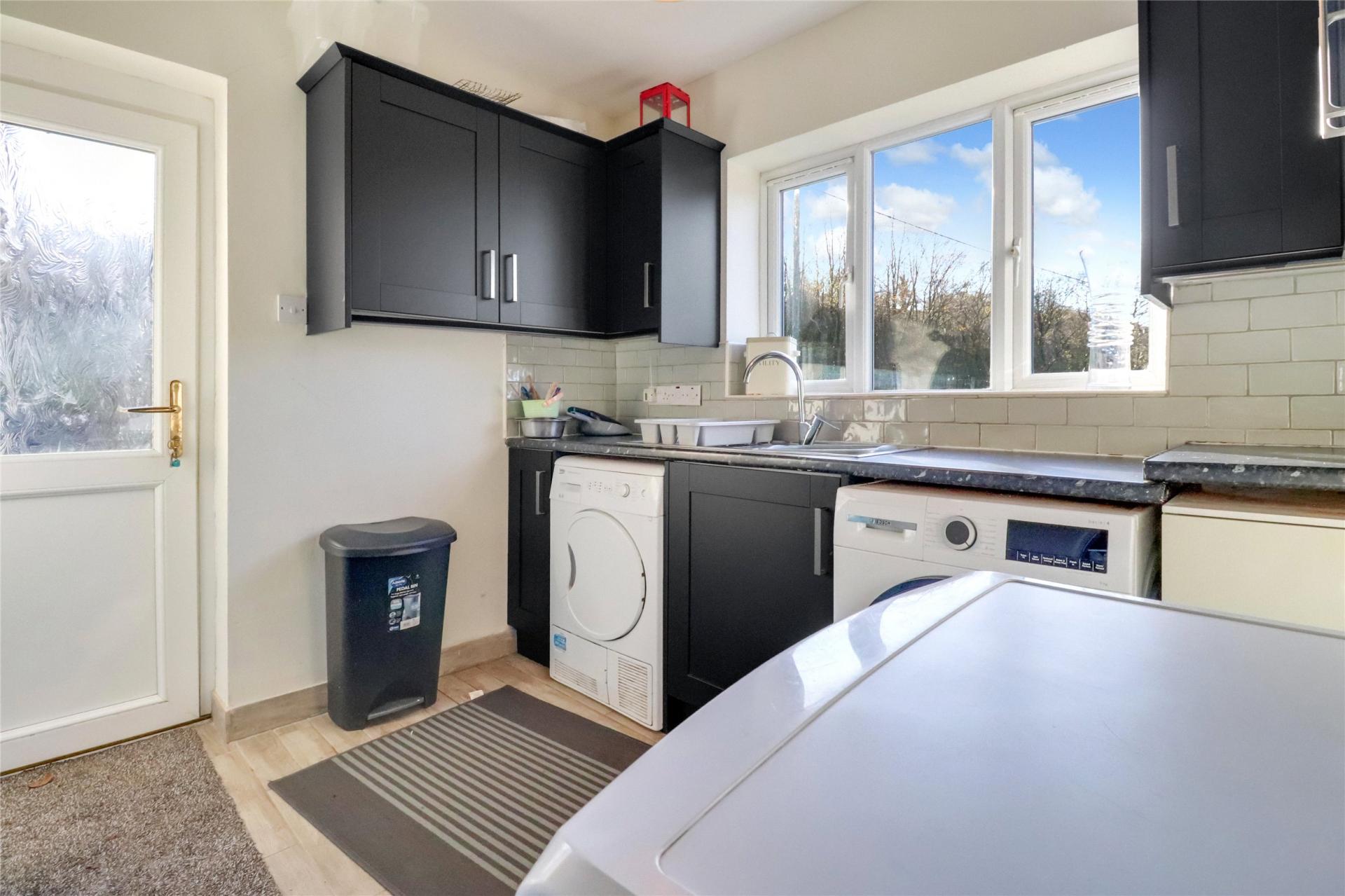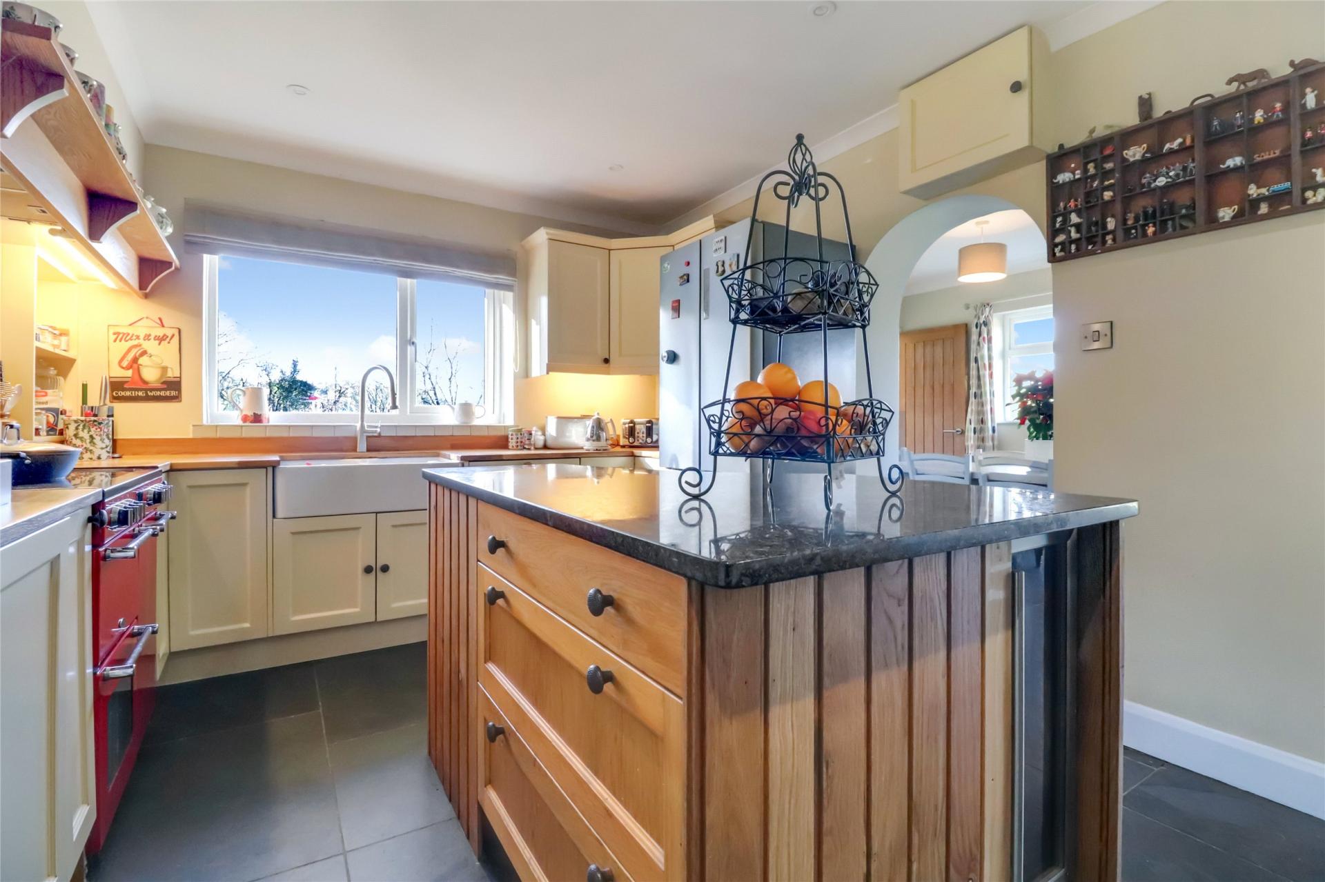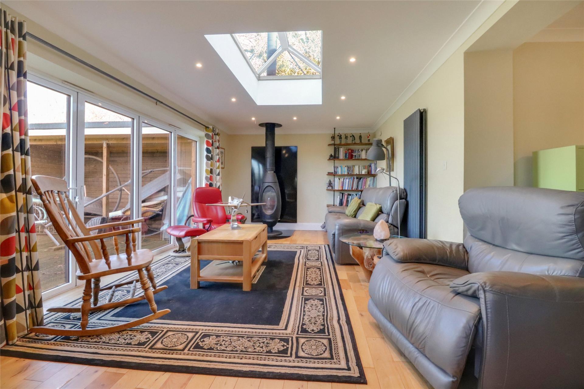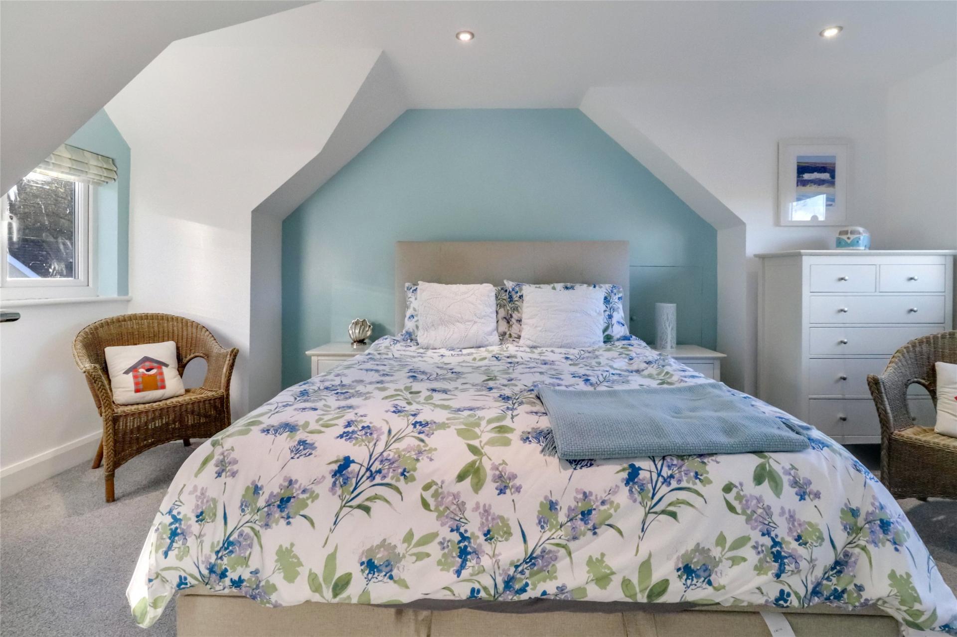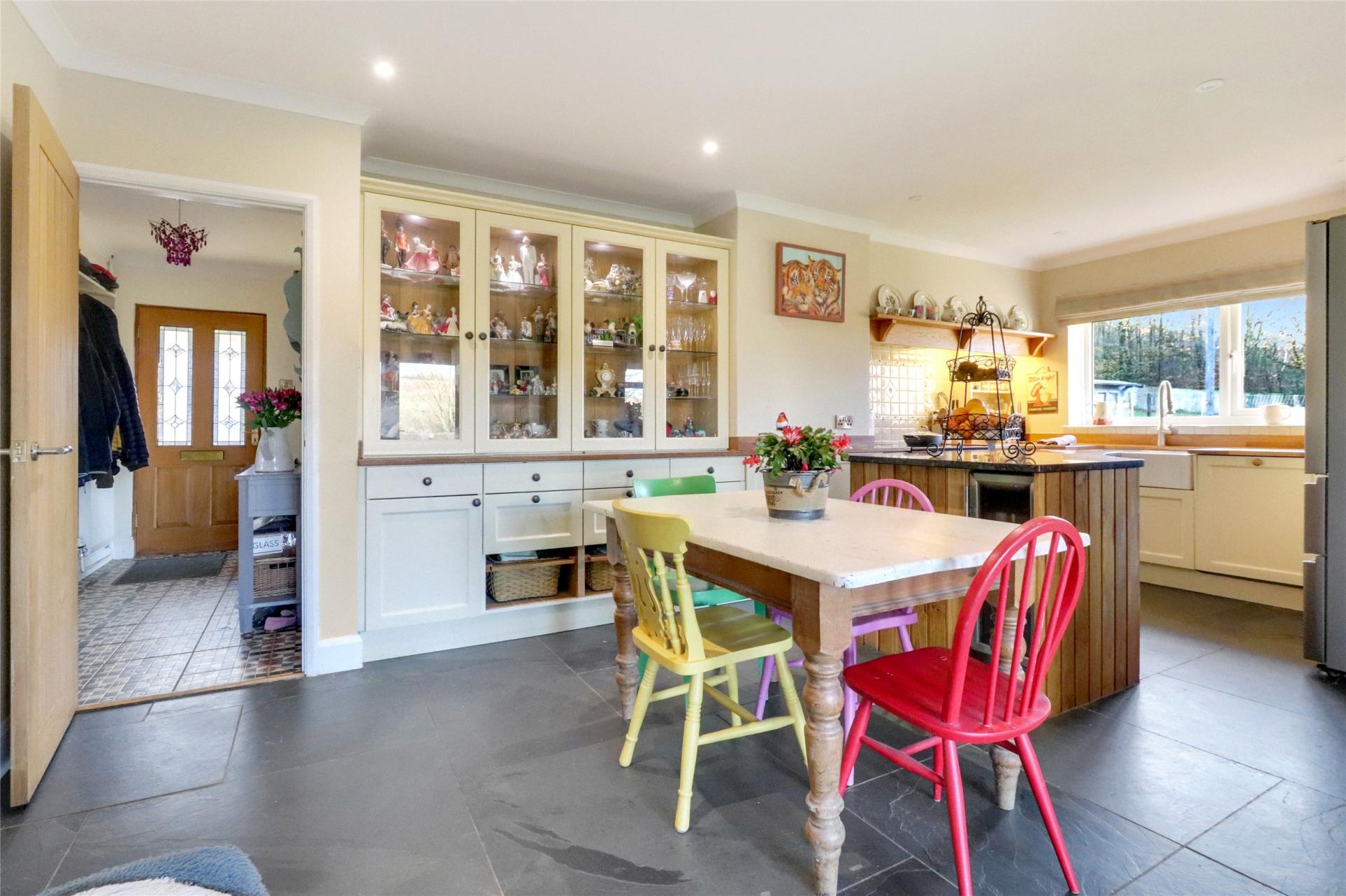 The main residence comprises a detached chalet bungalow offering generous and flexible accommodation. An L-shaped entrance hallway leads to two comfortable reception rooms, including a welcoming front lounge with a bay window, fireplace and wood-burning stove, and a spacious rear lounge with a bespoke stove, bi-fold doors to the garden and access to the dining room. The ground floor further includes a fitted kitchen with oak worktops, a double Belfast sink and a central island, which opens into a large dining area with matching slate flooring. There is also a useful study area, a fully fitted utility room and a guest shower room/WC. Two well-proportioned bedrooms can be found on this level, each enjoying pleasant natural light.