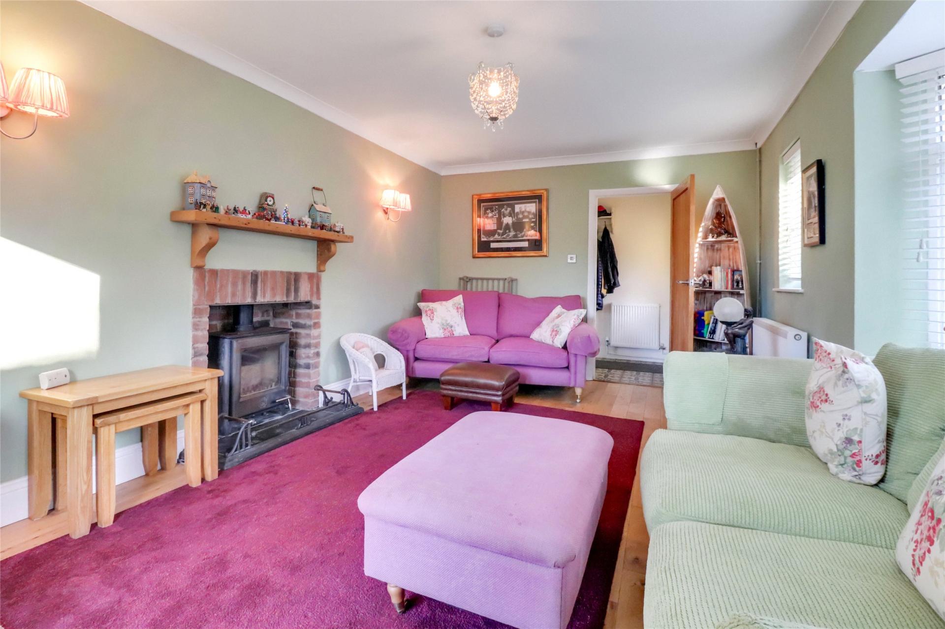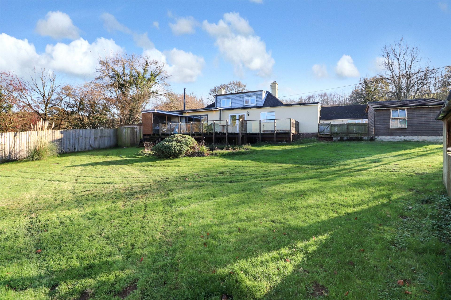 The property stands within approximately two acres of land, approached by a gravelled driveway. To the rear, the bungalow enjoys private gardens with a substantial decked terrace featuring glass-panelled balustrading and a hot tub. Beyond the decking is a lawned garden with a pond and open views across surrounding fields where wildlife is frequently seen. A covered car port with timber doors provides storage for logs. Heating is supplied by oil-fired central heating.
