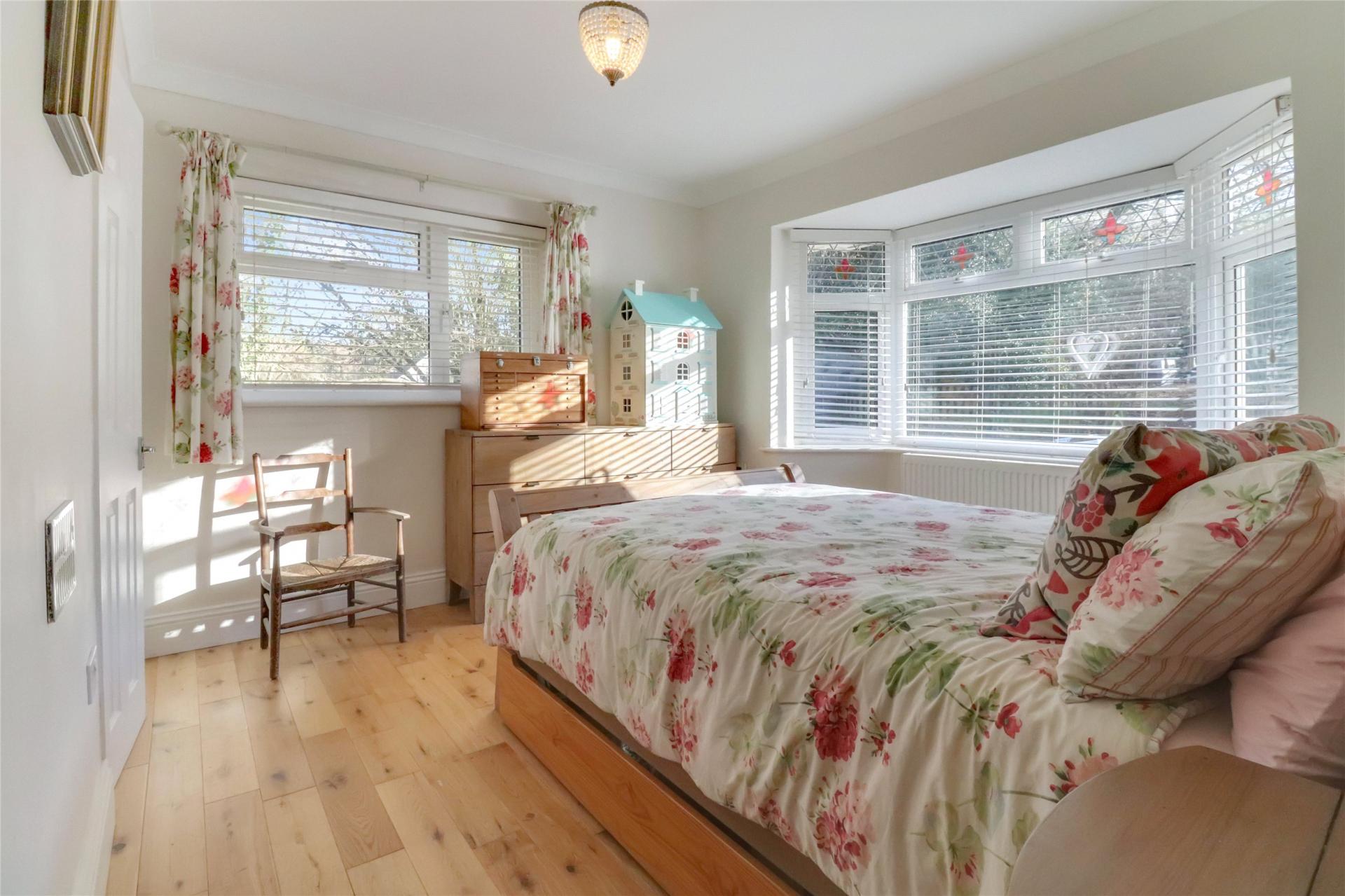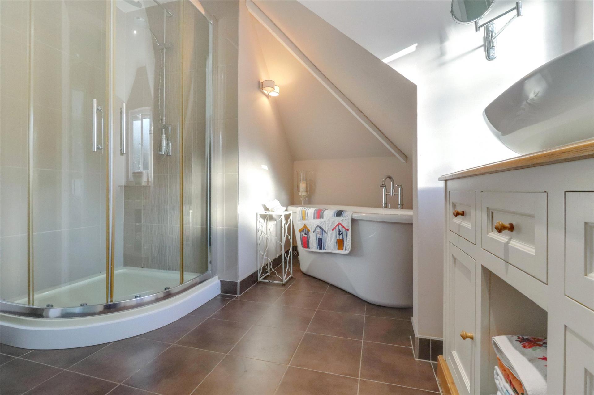 The first floor is dedicated to a generous principal bedroom with two windows overlooking the grounds. This bedroom benefits from an L-shaped dressing area and a luxurious en-suite bathroom complete with a roll-top bath, separate shower, wash hand basin and WC.