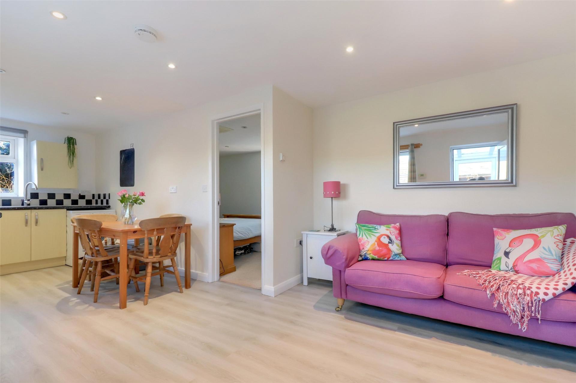 A detached one-bedroom annexe, fully self-contained and offering open-plan living with a fitted kitchen, a double bedroom with built-in wardrobe and an en-suite bathroom, provides excellent versatility. It has previously been used as a holiday let, staff accommodation and independent living space, offering further income potential or additional family use.