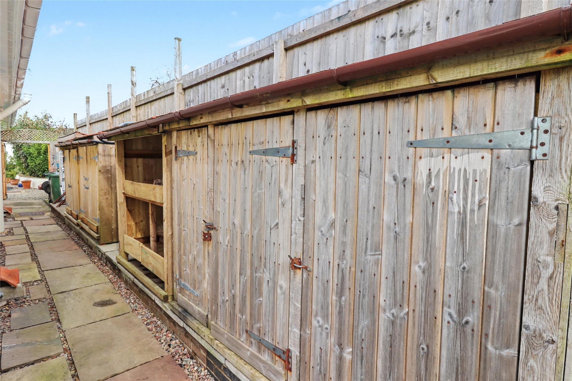To the side of the property, useful wooden stores provide excellent additional storage. There is also a further patio area and a personnel door into the garage, which benefits from power and lighting. Adjacent to the garage is an additional workshop area.