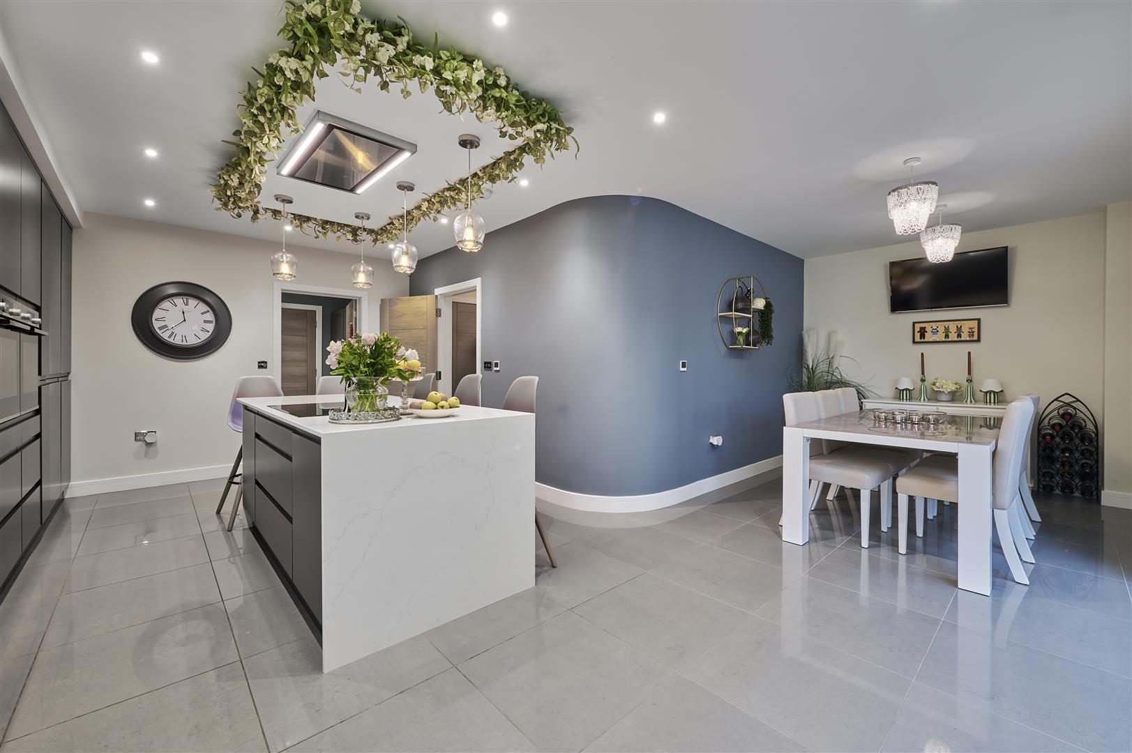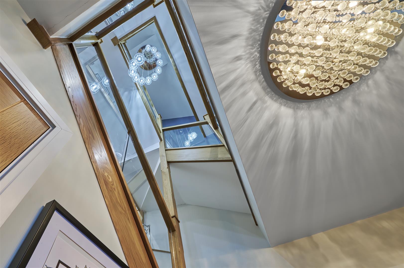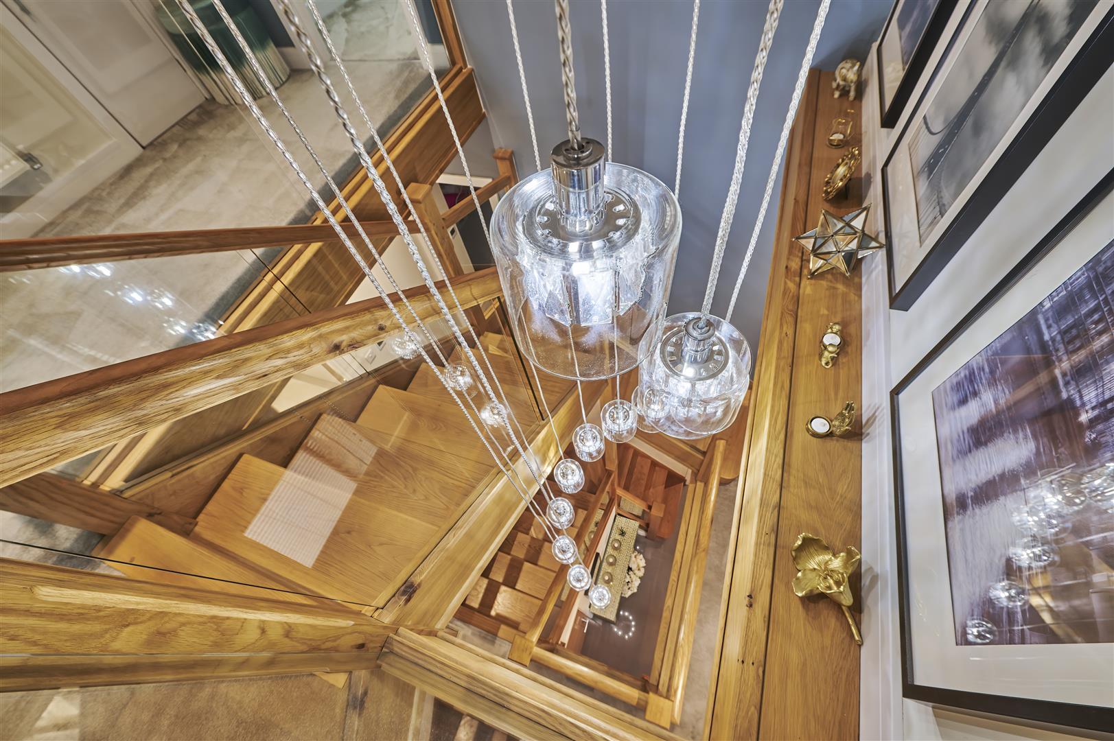 Inside, a stunning three-storey oak and glass staircase sits beneath a modern chandelier, creating an impressive central feature. The spacious kitchen is beautifully appointed with Bosch appliances, a kettle tap, sleek cabinetry and a large island, with bi-fold doors opening onto a generous patio and hot tub area-perfect for entertaining.
