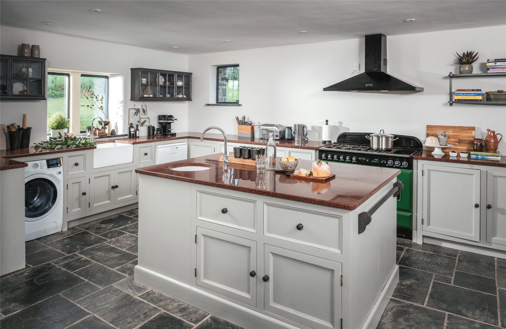 The well-equipped kitchen and breakfast room features a great selection of custom-built cabinets with ample drawer and cupboard space, all topped with elegant yet durable granite work surfaces. The room includes a ceramic sink with a mixer tap and two oak shelf corner cupboards for added storage. The 'Rangemaster' cooker offers two electric ovens, a grill, five gas rings, and a hot plate, with a matching extractor hood above. A central island unit, also with granite work surfaces, includes a circular preparation sink. The space is well-lit with recessed lighting and has a stylish slate-tiled floor, adding both practicality and character to the room.