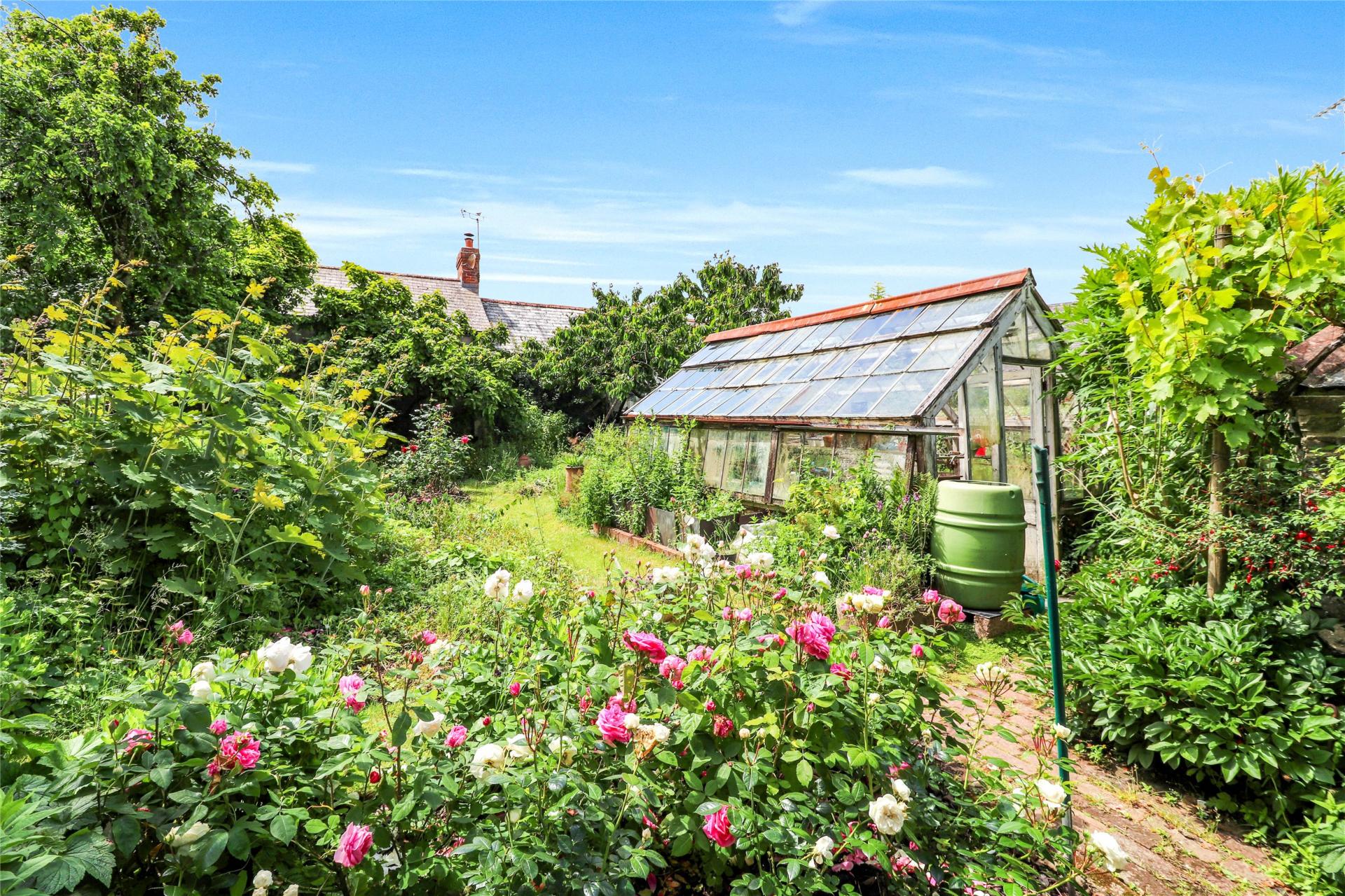 Mature walled garden with York stone terrace, 1930s greenhouse, and classic English planting
