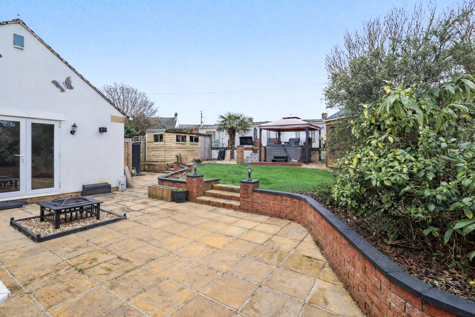 The double garage is currently used for storage. The rear garden (approx. 50' x 40') is tiered and includes patio areas, lawn, shed, summer house with sauna, hot tub and a potential vegetable plot.