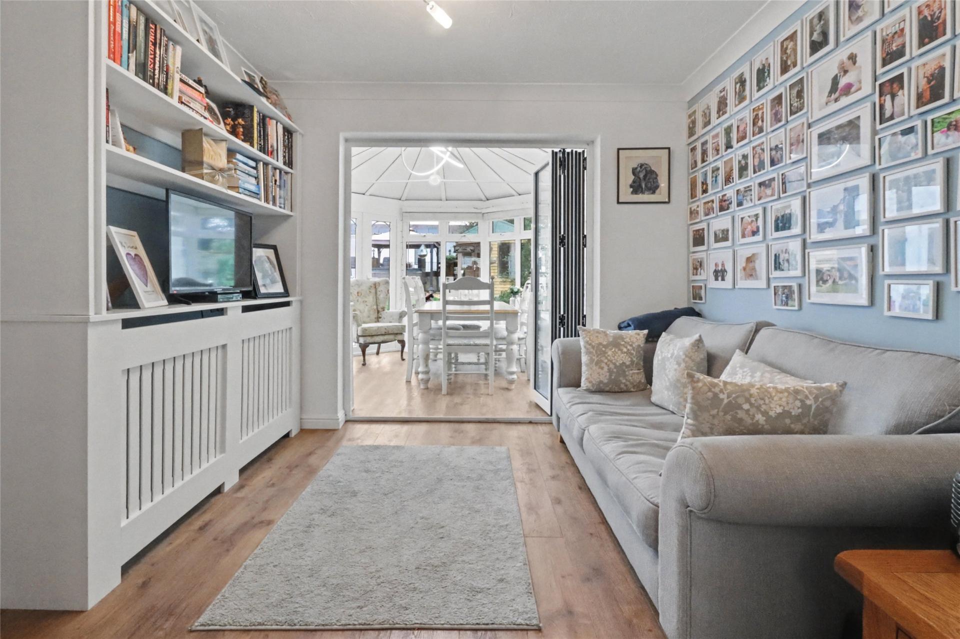 The accommodation comprises an entrance hall with cloakroom, an inviting living room with bay window and double doors through to a second reception room. Formerly the dining room, this space is now a stylish media room with fitted shelving and radiator cover, offering flexible use.