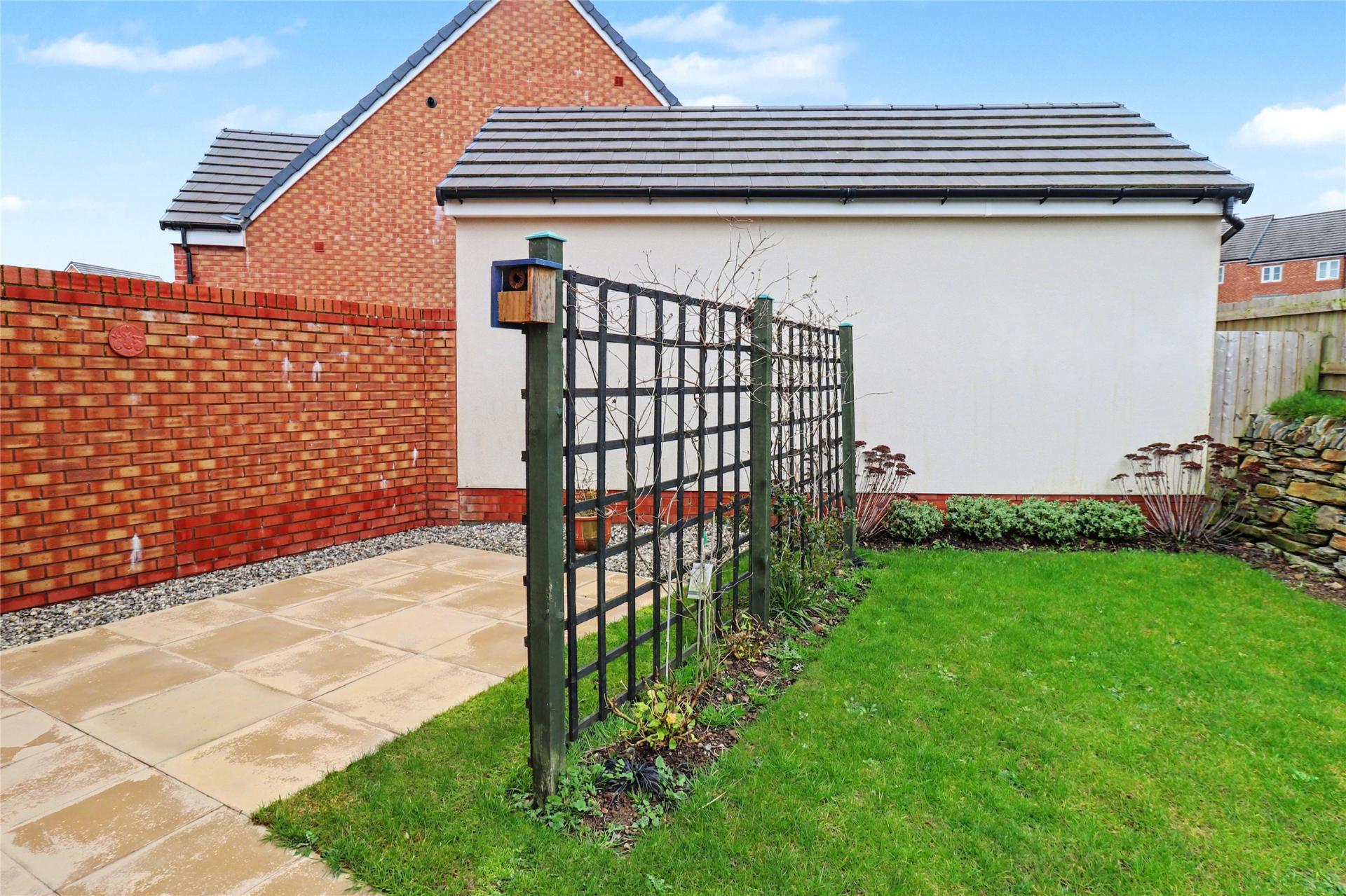 One of the standout features of this property is the rear garden, which enjoys a high level of privacy and is enclosed by a stone wall to the rear. The garden offers multiple outdoor spaces, including a patio directly outside the rear doors and a further patio running alongside the garage, complemented by a small gravelled area and an attractive flower bed. The property also benefits from a garage with an electric up-and-over door, as well as driveway parking.