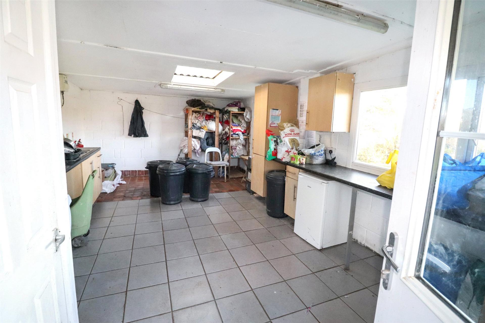 A gravelled driveway leads to the main reception block, an open-fronted building housing seven secure kennels and a covered area for meeting dog owners, as well as an adjoining dog grooming room. A large detached garage with electric roller doors sits nearby and includes an adjoining isolation kennel with large run. To the north is a secure dog exercise enclosure, and beyond this lie two substantial rows of kennels providing a further twenty-two units. Between these blocks are a kennel kitchen, laundry facilities and staff amenities. A dedicated exercise paddock completes the professional setup, along with covered enclosed pens and walkways.