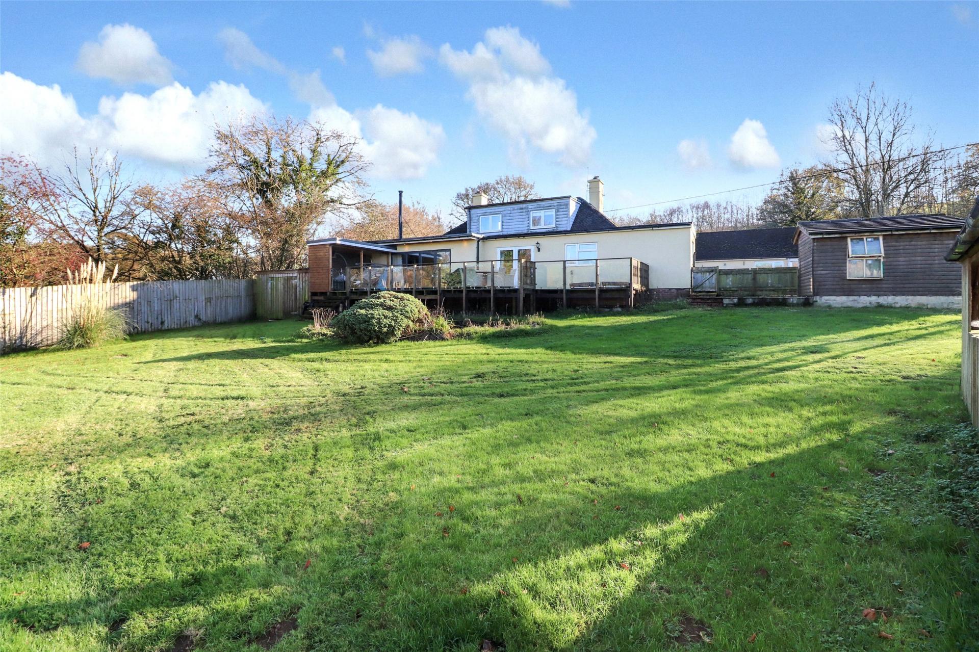 The property stands within approximately two acres of land, approached by a gravelled driveway. To the rear, the bungalow enjoys private gardens with a substantial decked terrace featuring glass-panelled balustrading and a hot tub. Beyond the decking is a lawned garden with a pond and open views across surrounding fields where wildlife is frequently seen. A covered car port with timber doors provides storage for logs. Heating is supplied by oil-fired central heating.