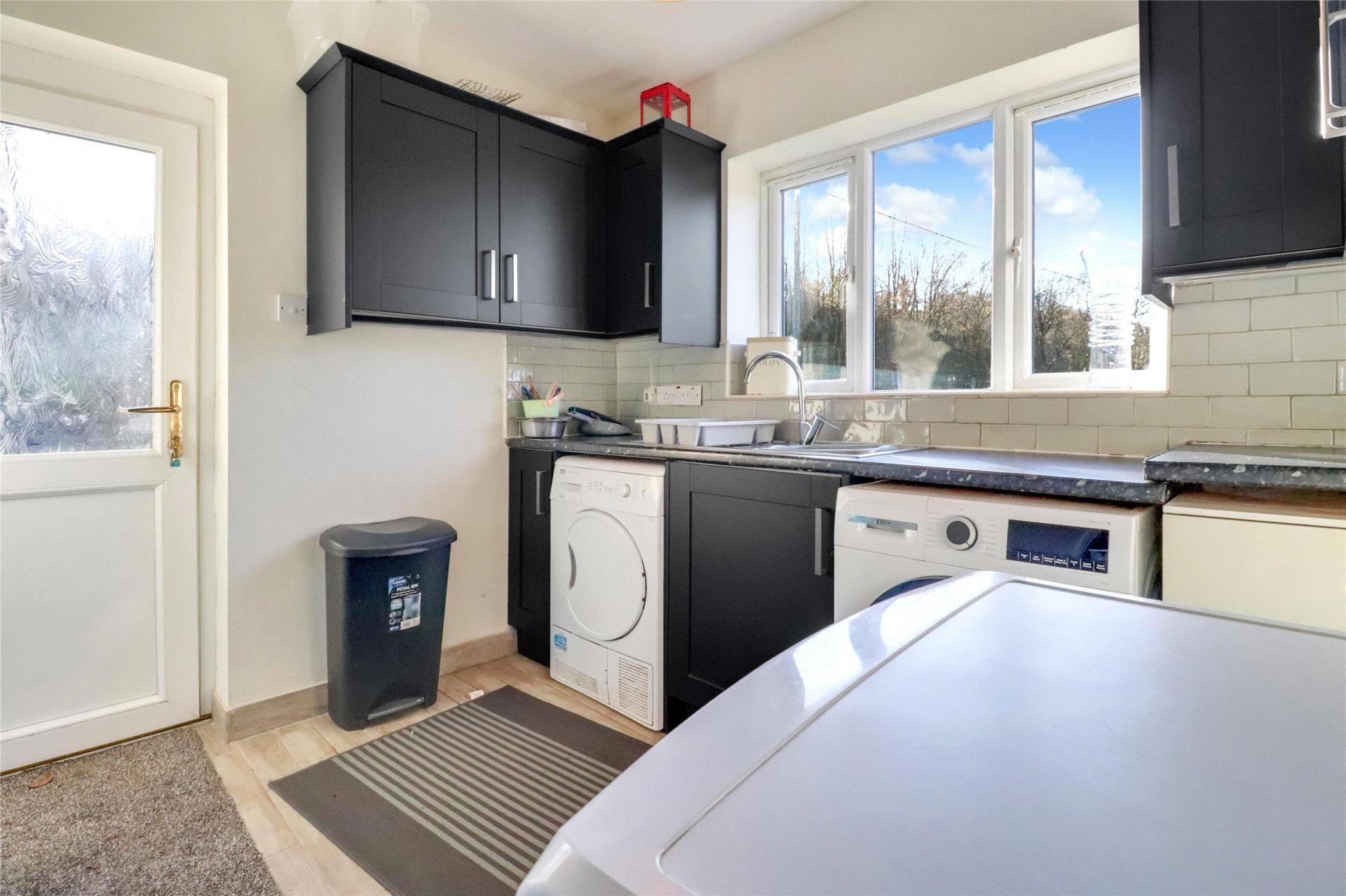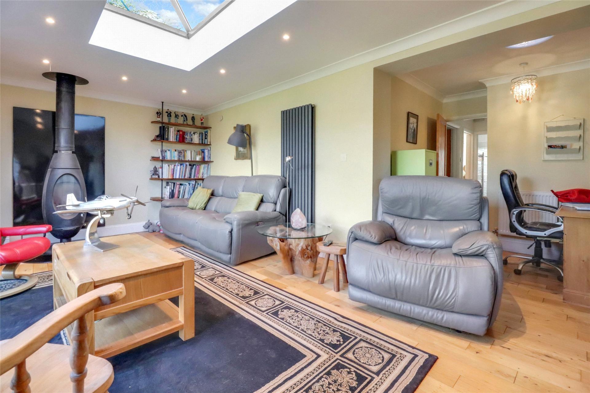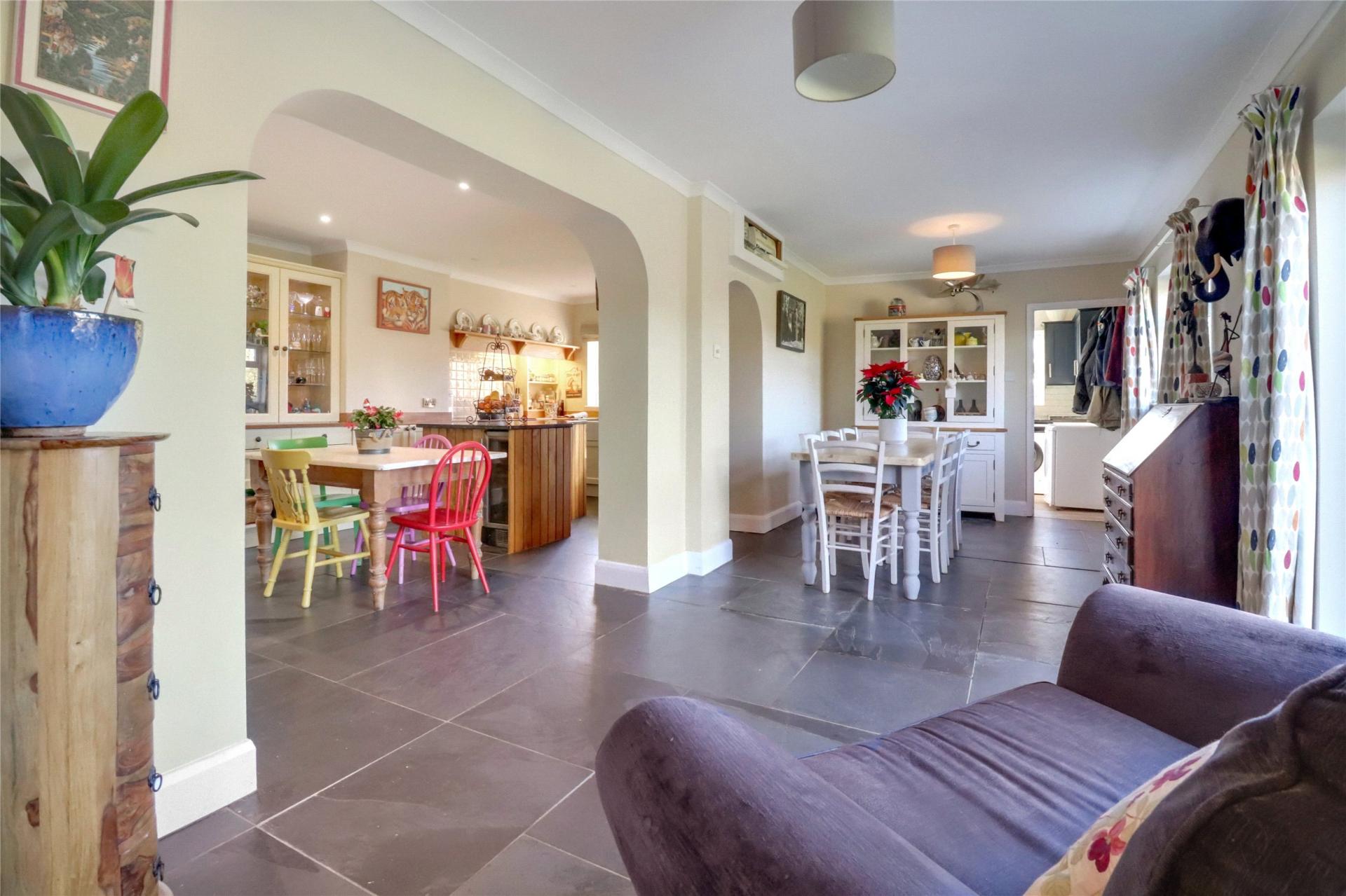 The main residence comprises a detached chalet bungalow offering generous and flexible accommodation. An L-shaped entrance hallway leads to two comfortable reception rooms, including a welcoming front lounge with a bay window, fireplace and wood-burning stove, and a spacious rear lounge with a bespoke stove, bi-fold doors to the garden and access to the dining room. The ground floor further includes a fitted kitchen with oak worktops, a double Belfast sink and a central island, which opens into a large dining area with matching slate flooring. There is also a useful study area, a fully fitted utility room and a guest shower room/WC. Two well-proportioned bedrooms can be found on this level, each enjoying pleasant natural light.