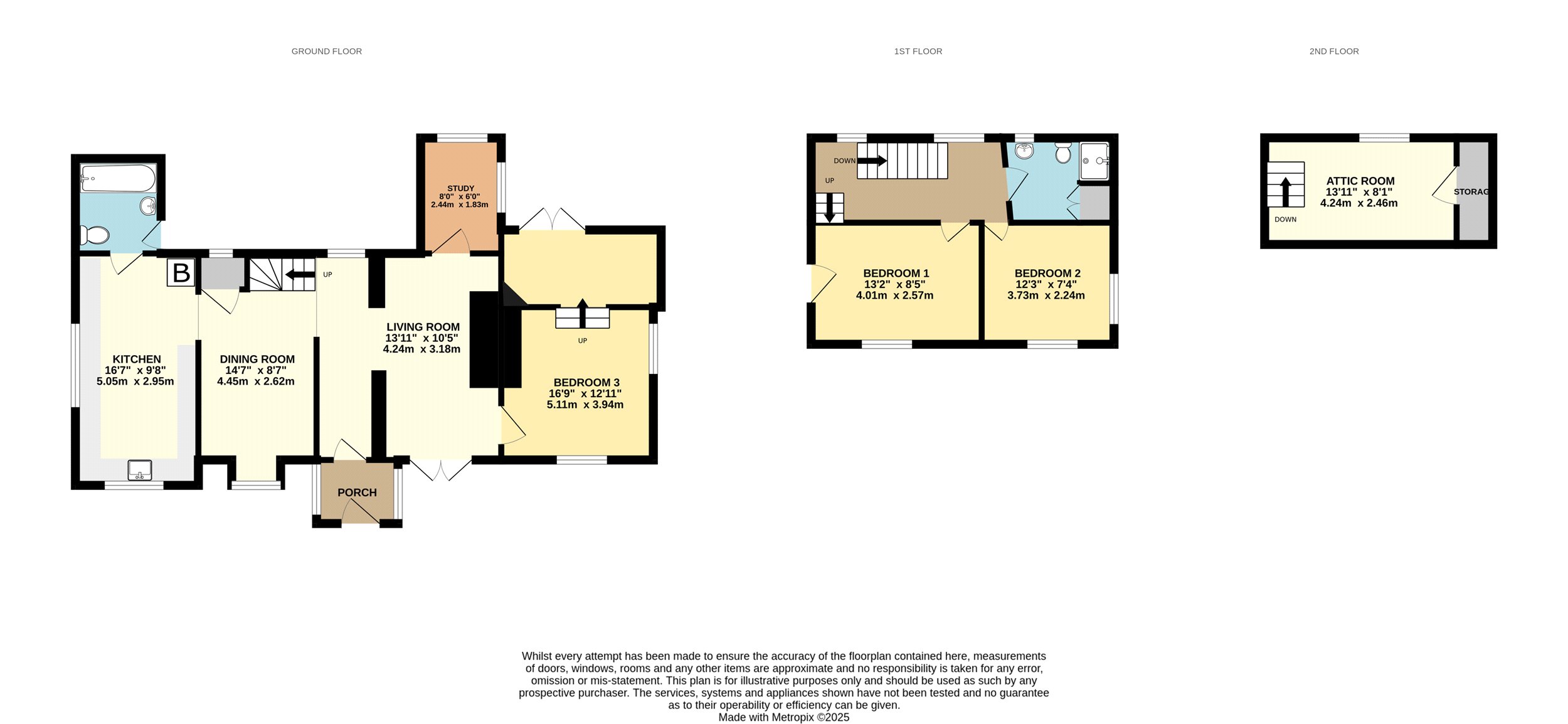 Upstairs, there are two further double bedrooms and a family shower room complete with shower, WC, and wash hand basin. A wide and airy landing connects the rooms and also gives access to a staircase leading up to the attic room, currently used for storage and as a second home office.