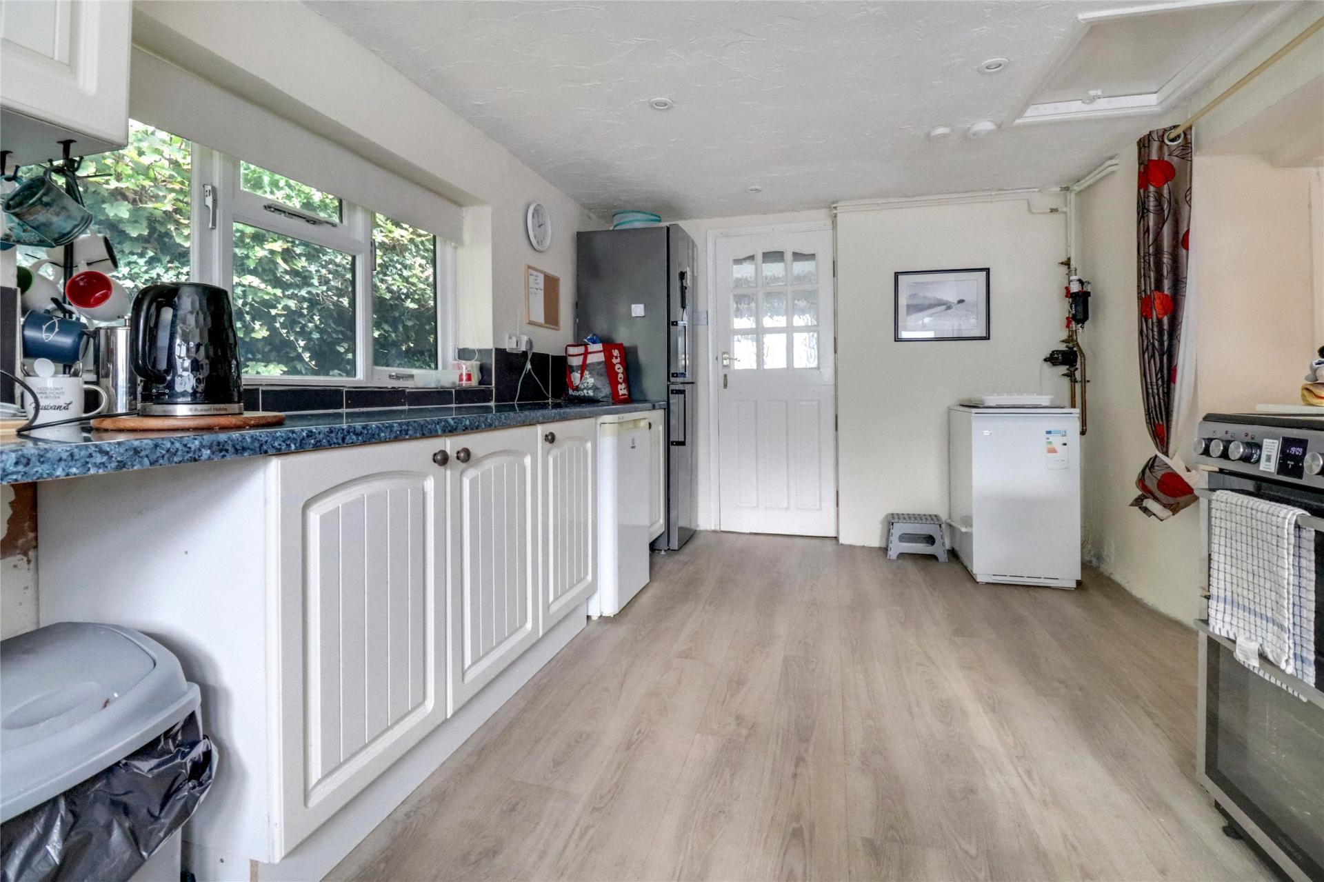 The front porch opens into a welcoming living room where an inglenook fireplace and exposed wooden beams create a classic cottage atmosphere. The adjoining dining room offers ample space for a family sized table and enjoys a pleasant outlook to the front. The kitchen includes a generous range of wall and base units, integrated appliances, and space for both an under-counter fridge and dishwasher. Off the kitchen, a ground floor bathroom features a bath, WC, and wash hand basin, with a door leading directly to the rear garden.