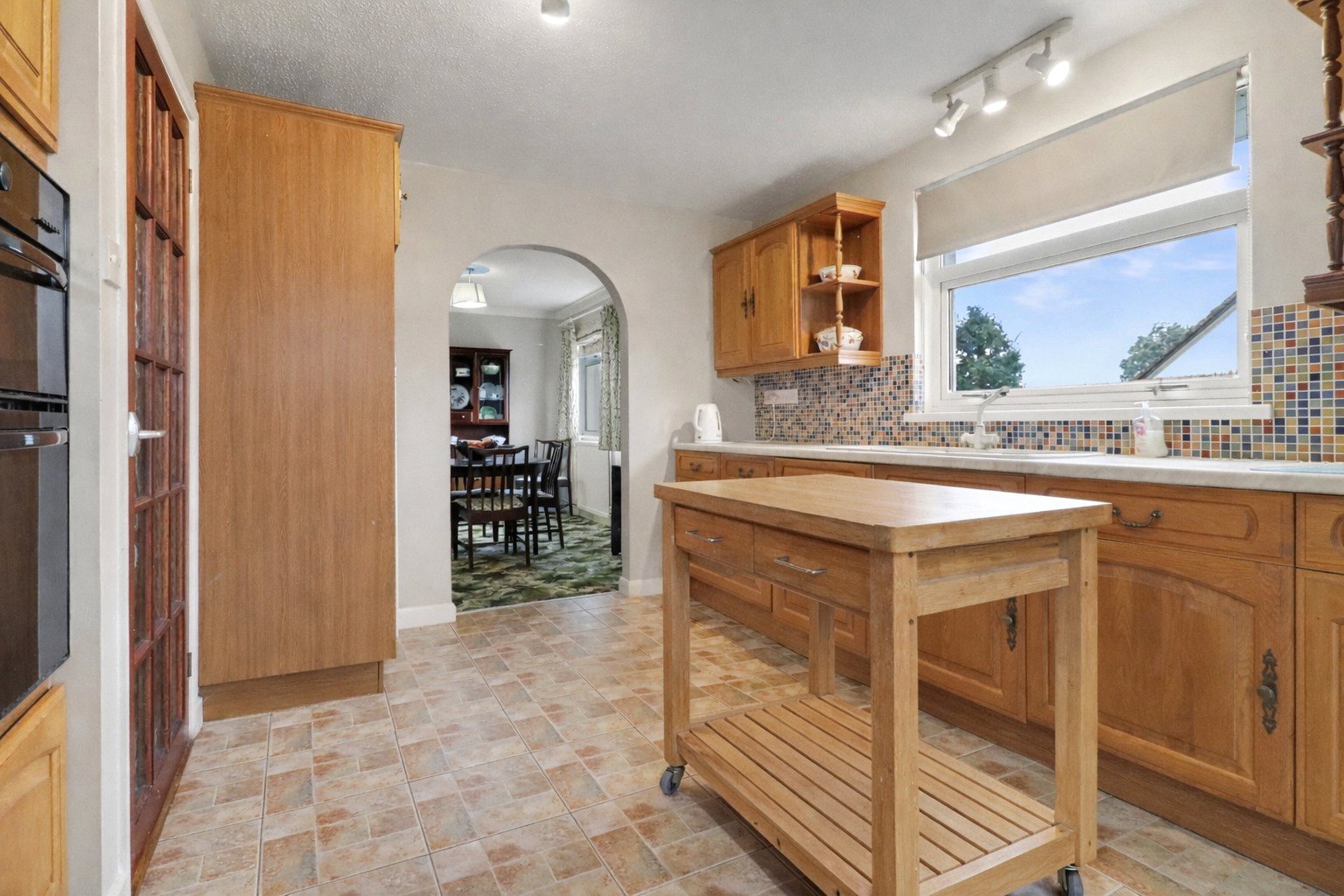 Further along the hallway is the dining room, which opens via an archway into the well-fitted kitchen. The kitchen comprises matching wall and base units, an integrated oven, grill and hob, and a door providing access to the side of the property.