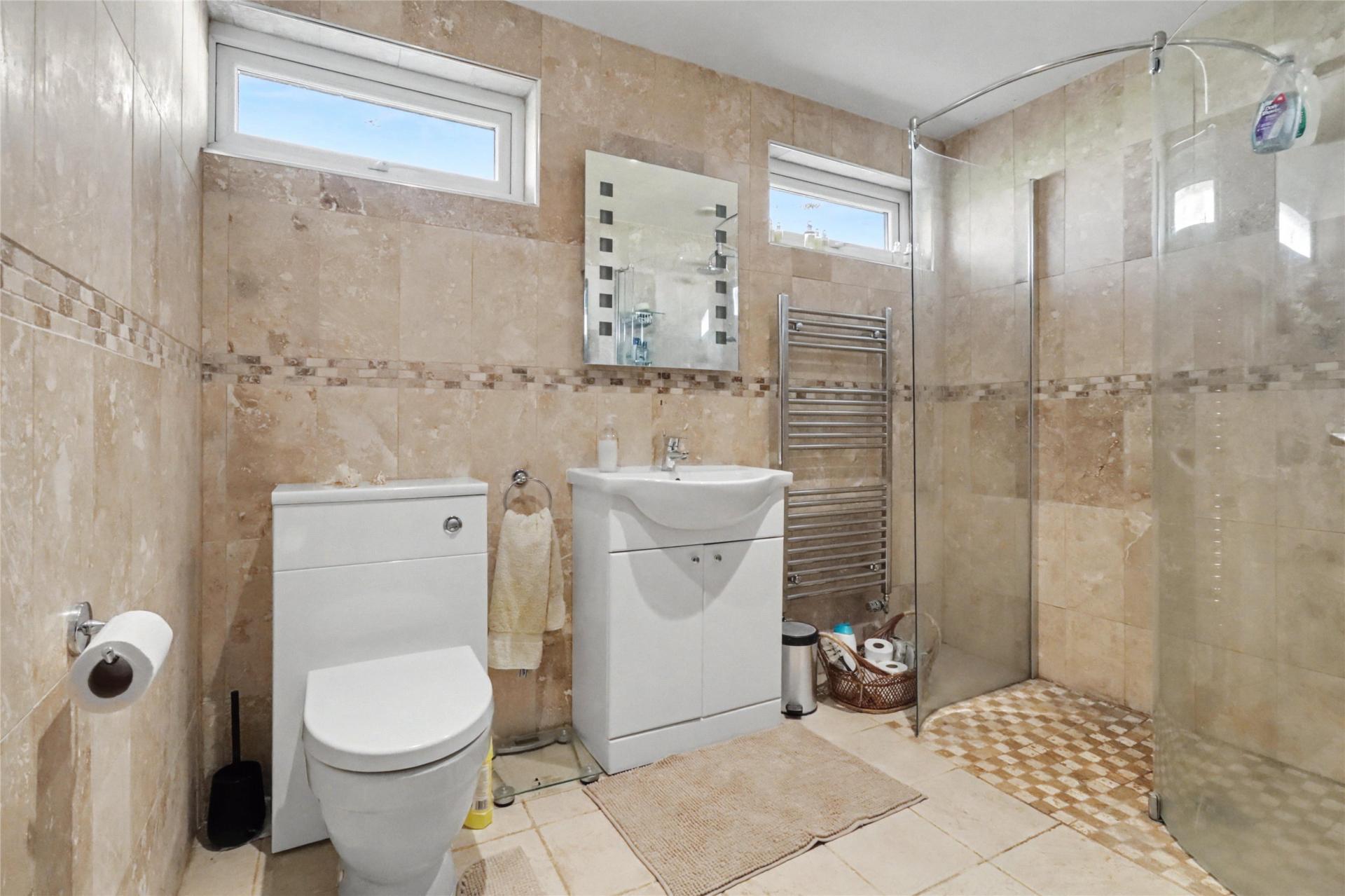 From the hallway there are three well-proportioned bedrooms. The principal bedroom is a spacious double, while bedrooms two and three are both small doubles, all benefiting from fitted wardrobes. The modern family bathroom features a walk-in shower, WC and wash hand basin, complemented by matching wall and floor tiling.