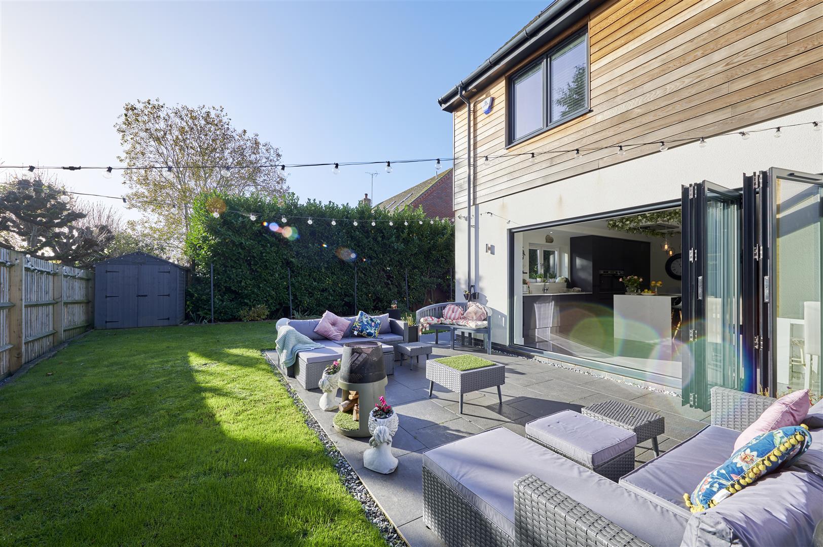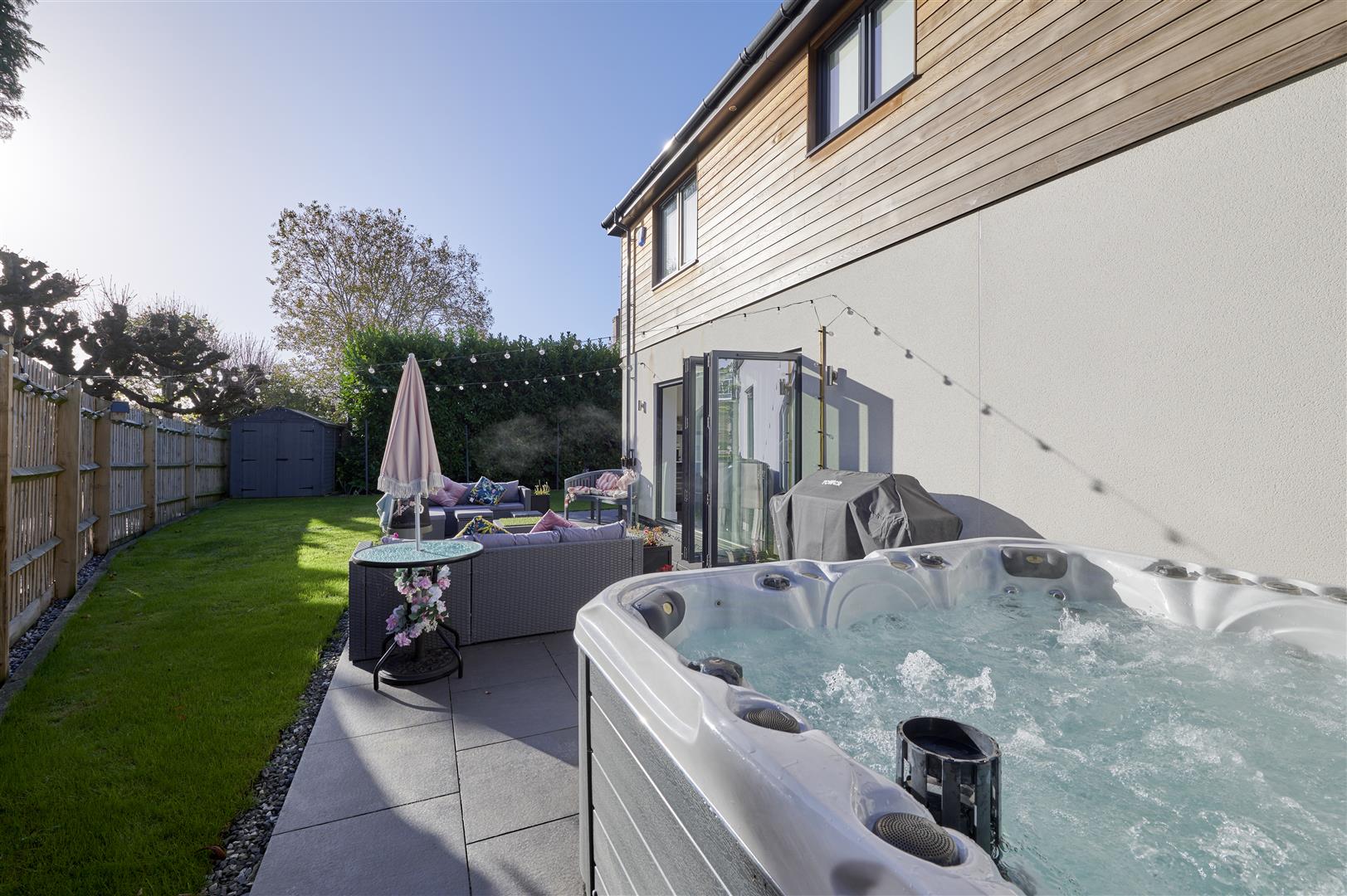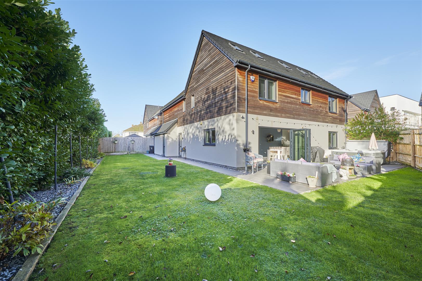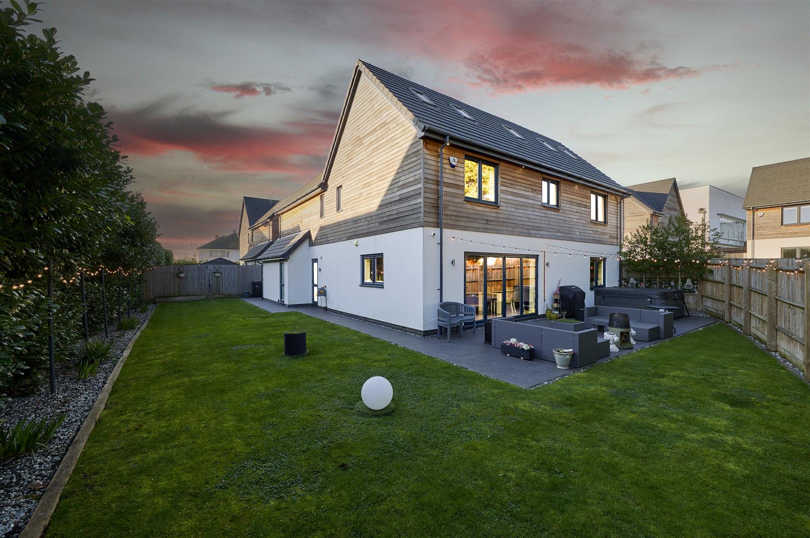 Inside, a stunning three-storey oak and glass staircase sits beneath a modern chandelier, creating an impressive central feature. The spacious kitchen is beautifully appointed with Bosch appliances, a kettle tap, sleek cabinetry and a large island, with bi-fold doors opening onto a generous patio and hot tub area-perfect for entertaining.