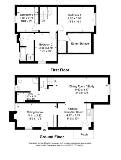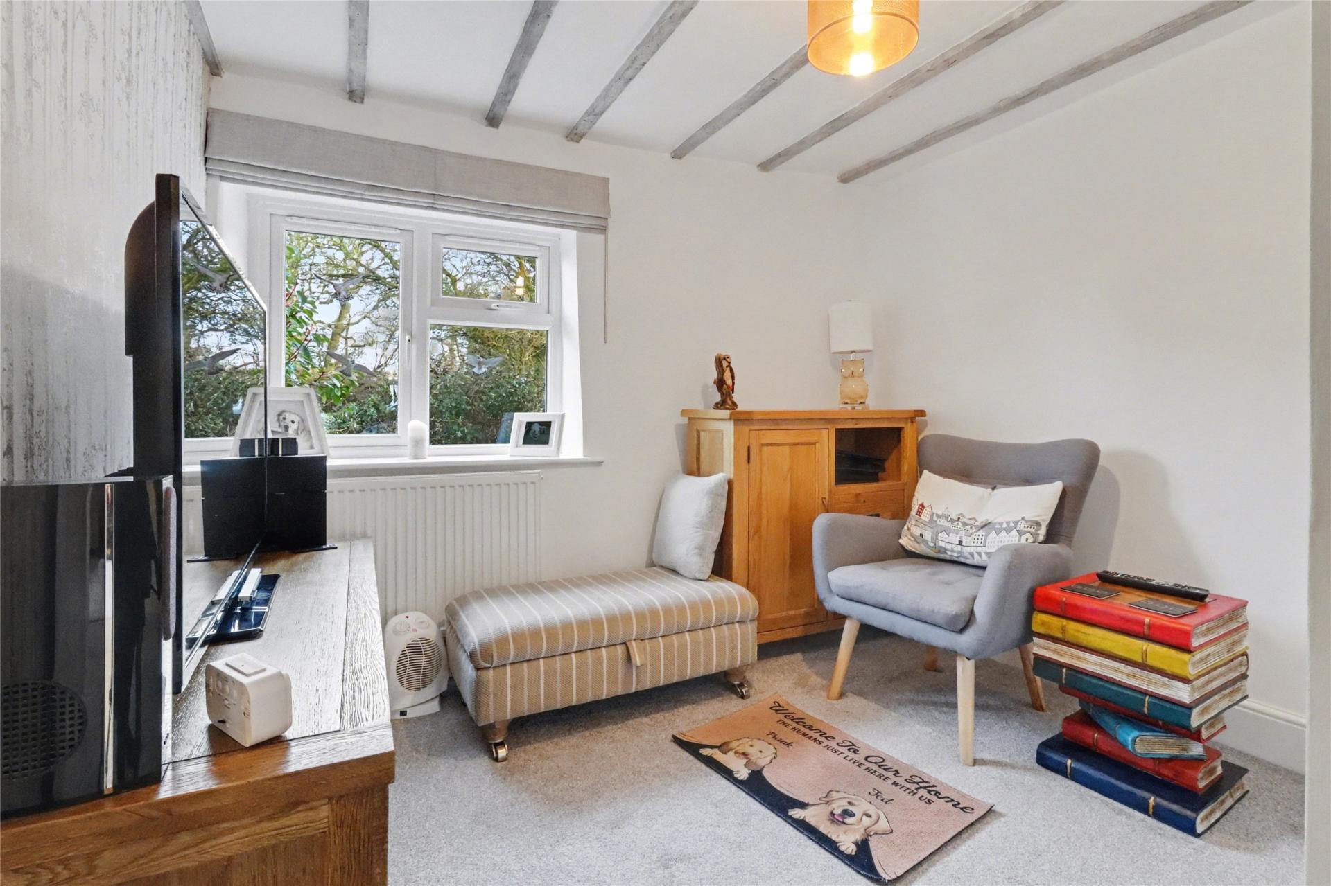 Stairs rise to the first floor. To the left is a spacious double bedroom enjoying countryside views, fitted wardrobes, and access to useful eaves storage. The second double bedroom is also well presented and benefits from an en-suite bathroom in excellent decorative order, fitted with a bath, WC, and wash hand basin. Bedroom three is a good-sized single or small double room, further enhanced by fitted wardrobes.