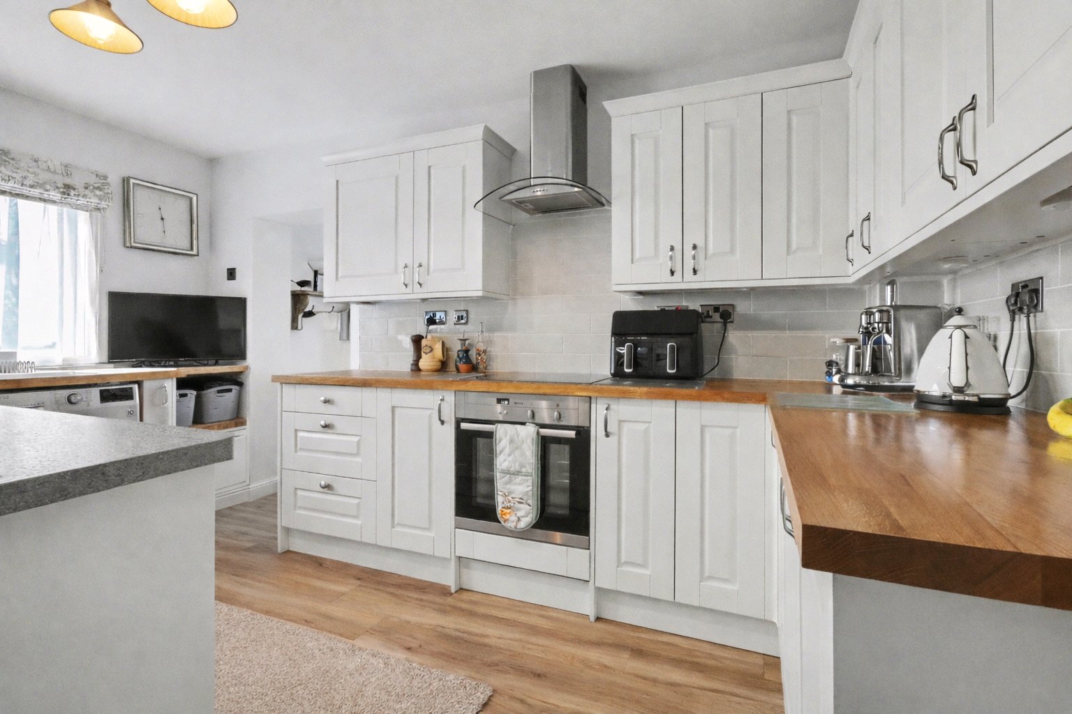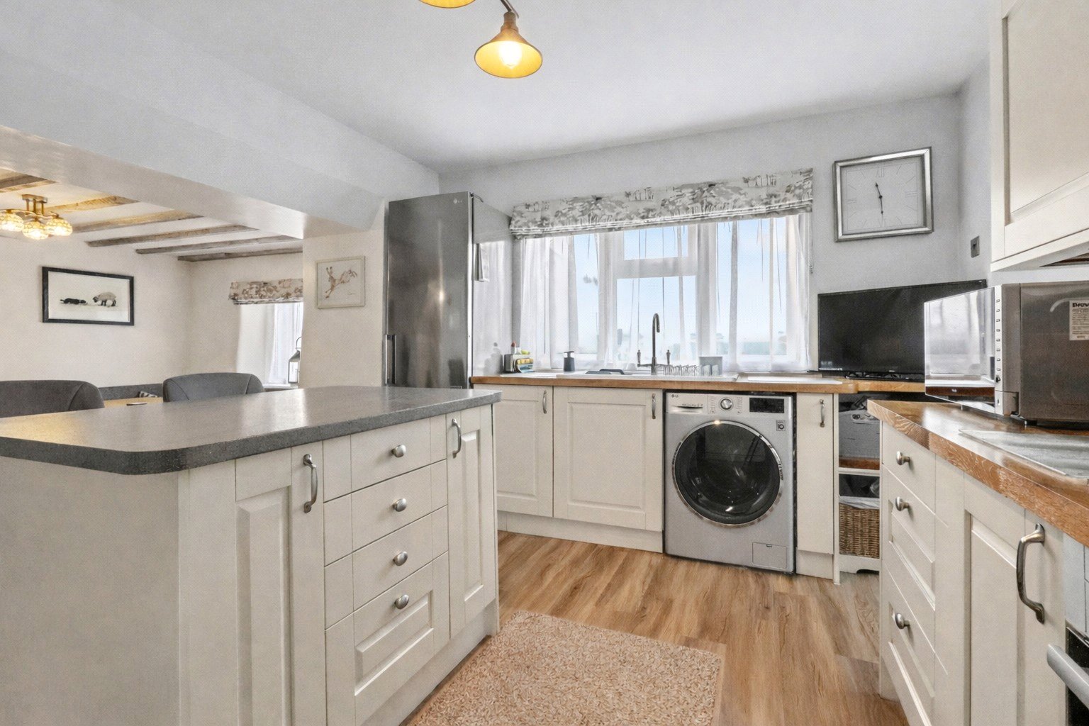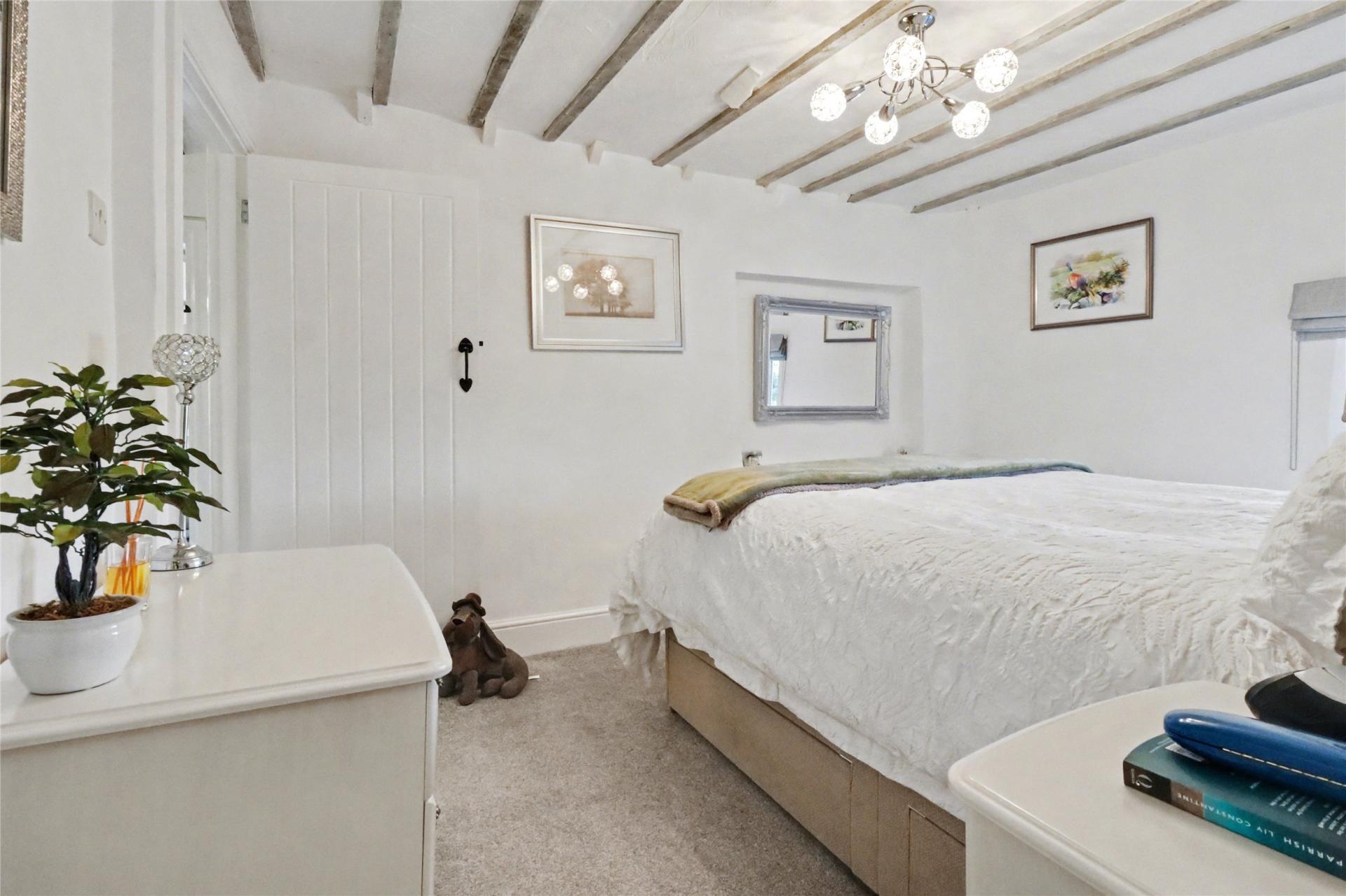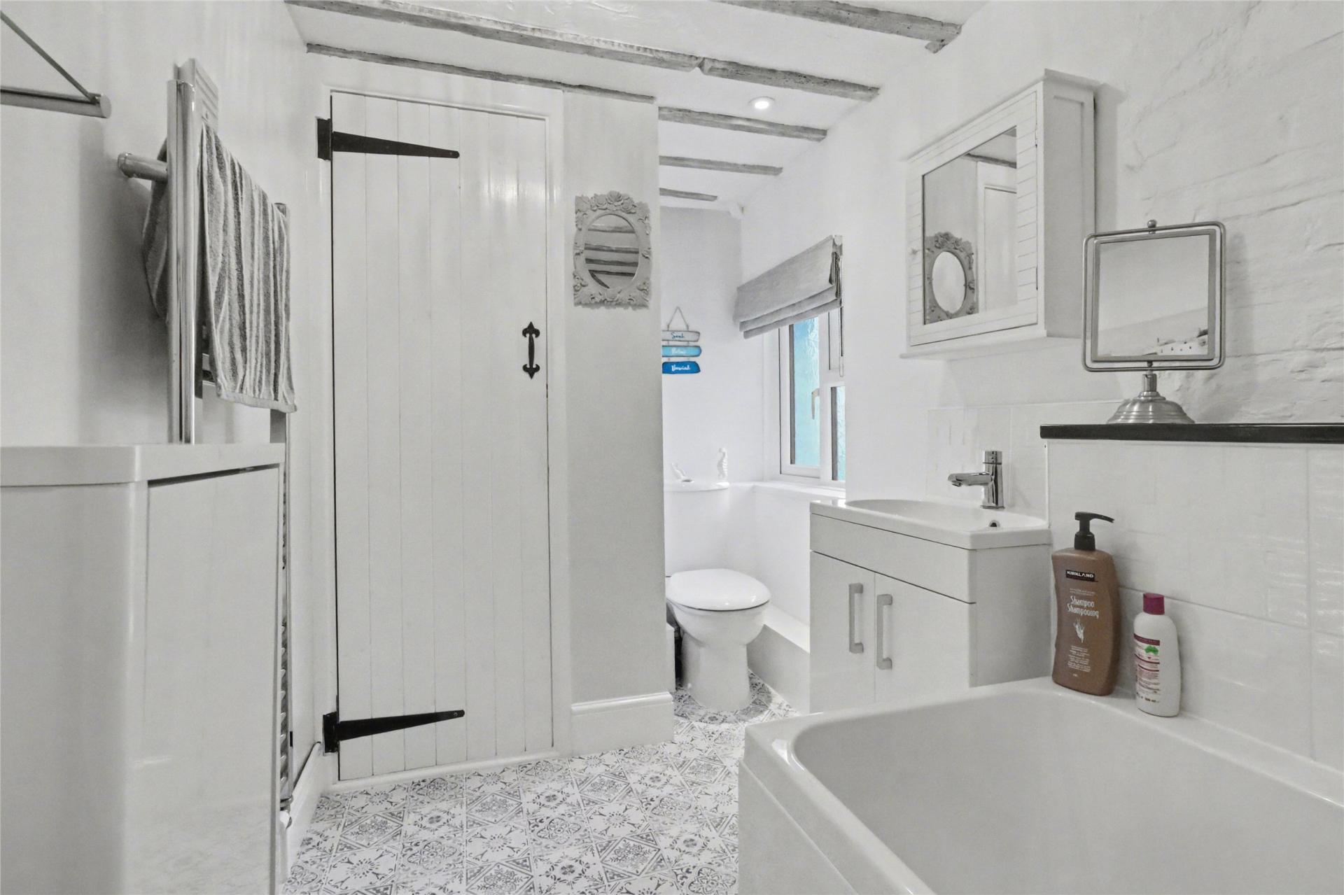 From the kitchen, a door leads into the cosy and beautifully presented lounge, which boasts an inglenook fireplace with an exposed beam and wood-burning stove. An additional door provides direct access to the garden. Also accessed from the kitchen is a practical utility area with plumbing for a washing machine, which in turn leads to a spacious and well-appointed ground floor shower room comprising a walk-in shower, WC, and wash hand basin.