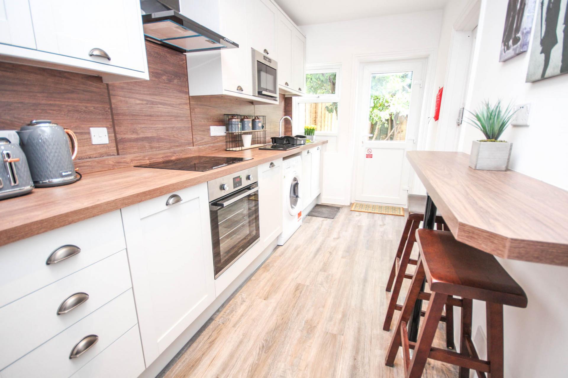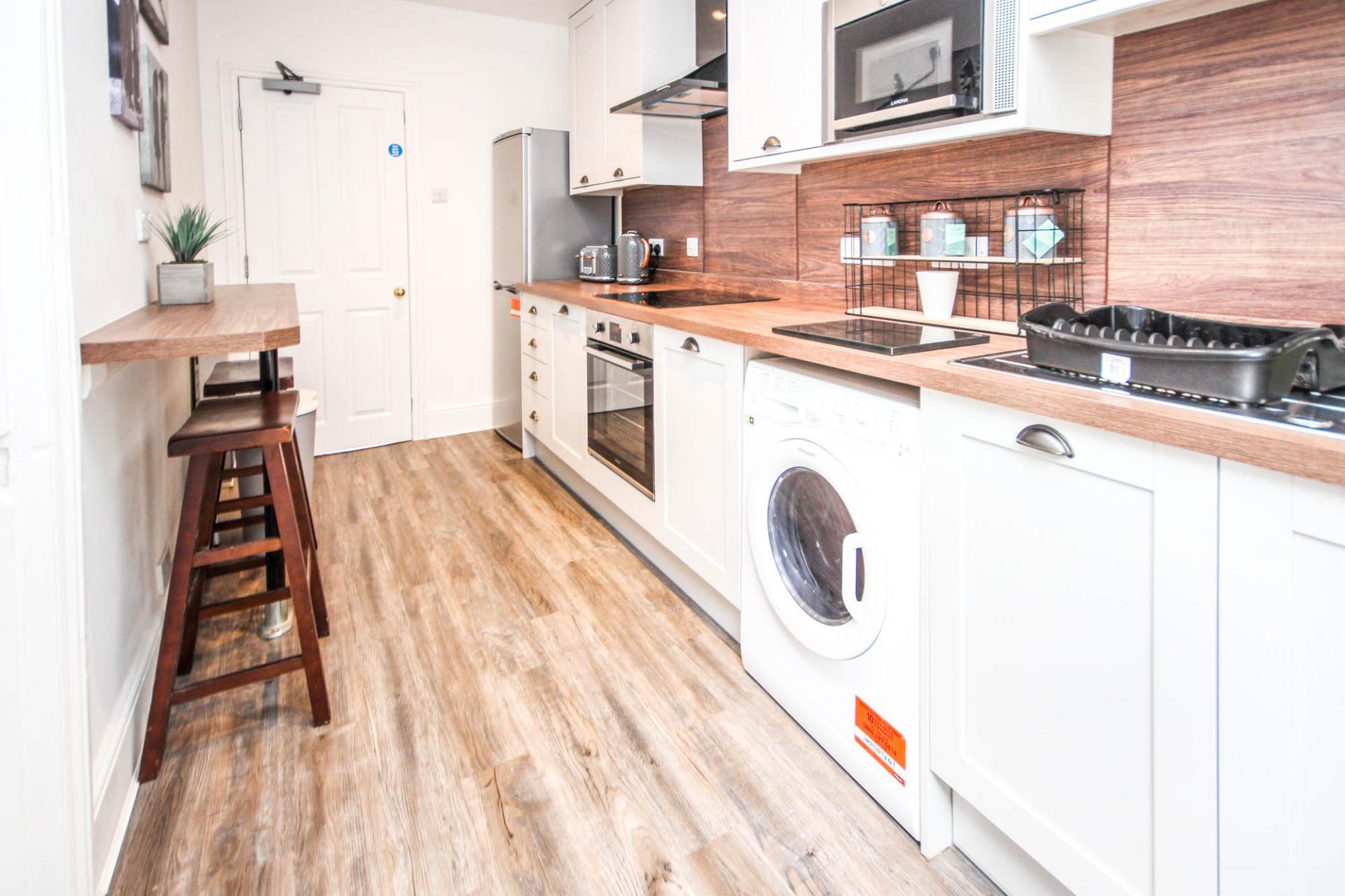 • Communal Modern Kitchen With Pecan Worktops, Breakfast Bar & Built In Appliances Including Washer Dryer & Dishwasher